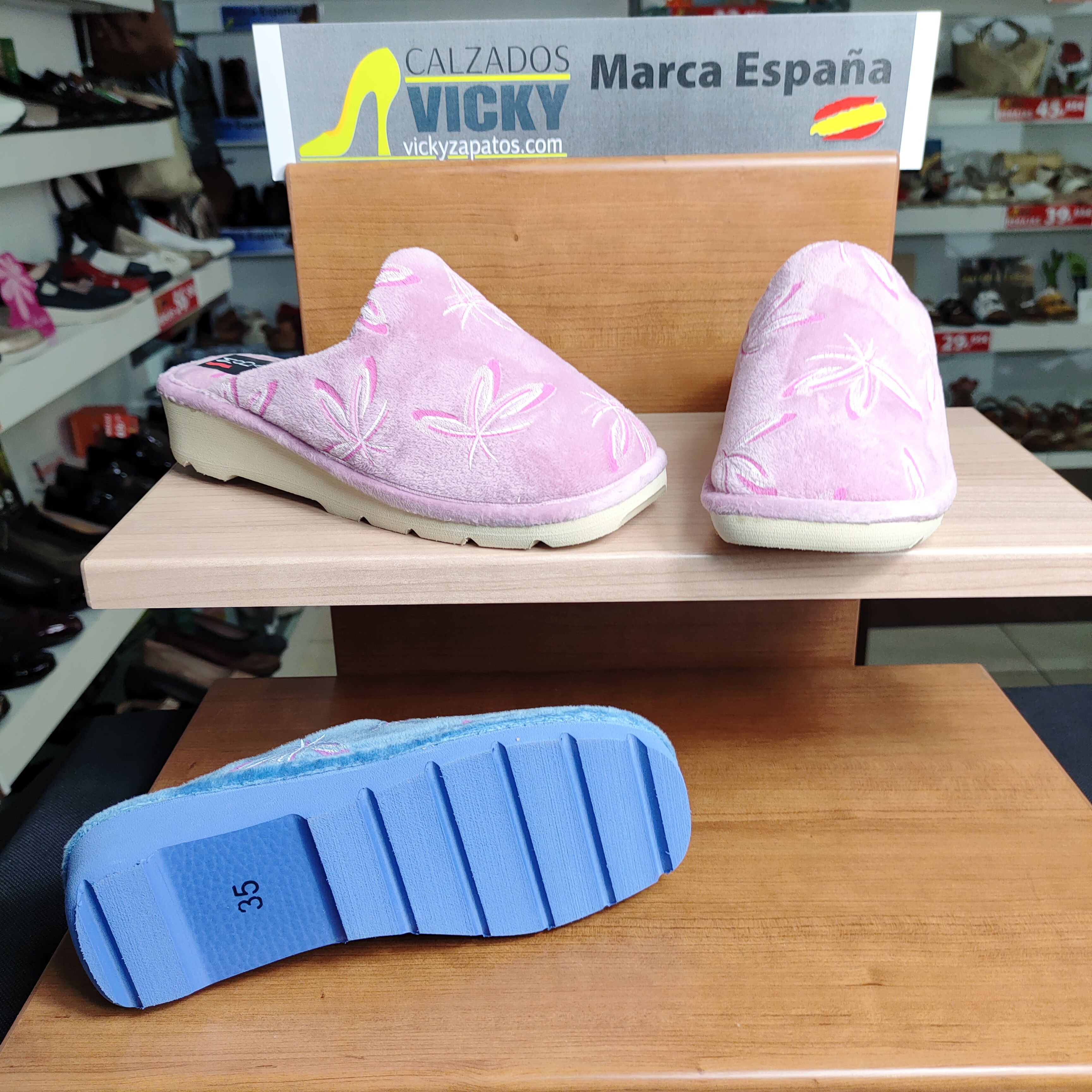 Zapatilla de casa Berevere de mujer en tejido afelpado con estampado floral. Con plantilla acolchada y piso de caucho antideslizante ultraligero. Fabricadas en España. Tallas del 35 al 41.