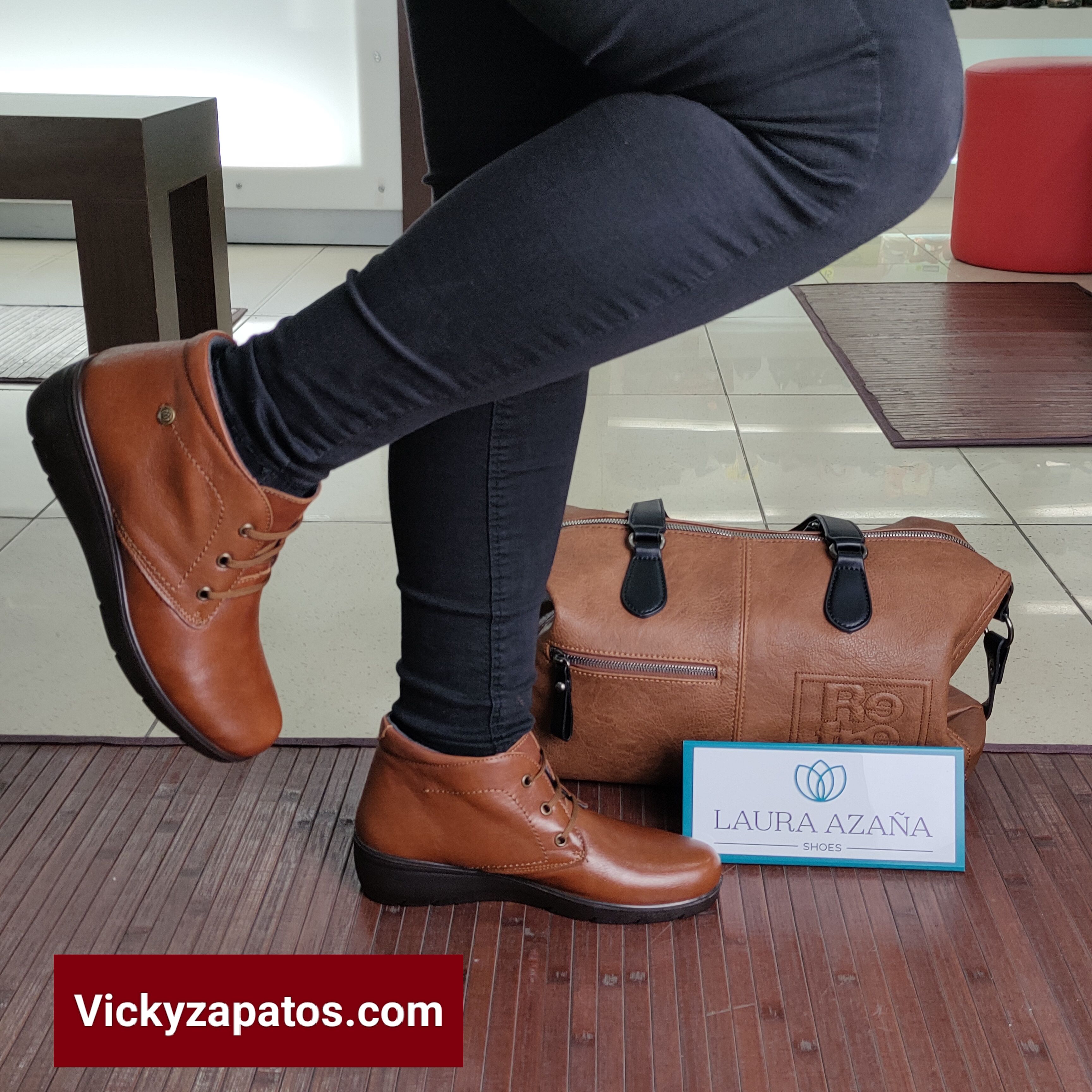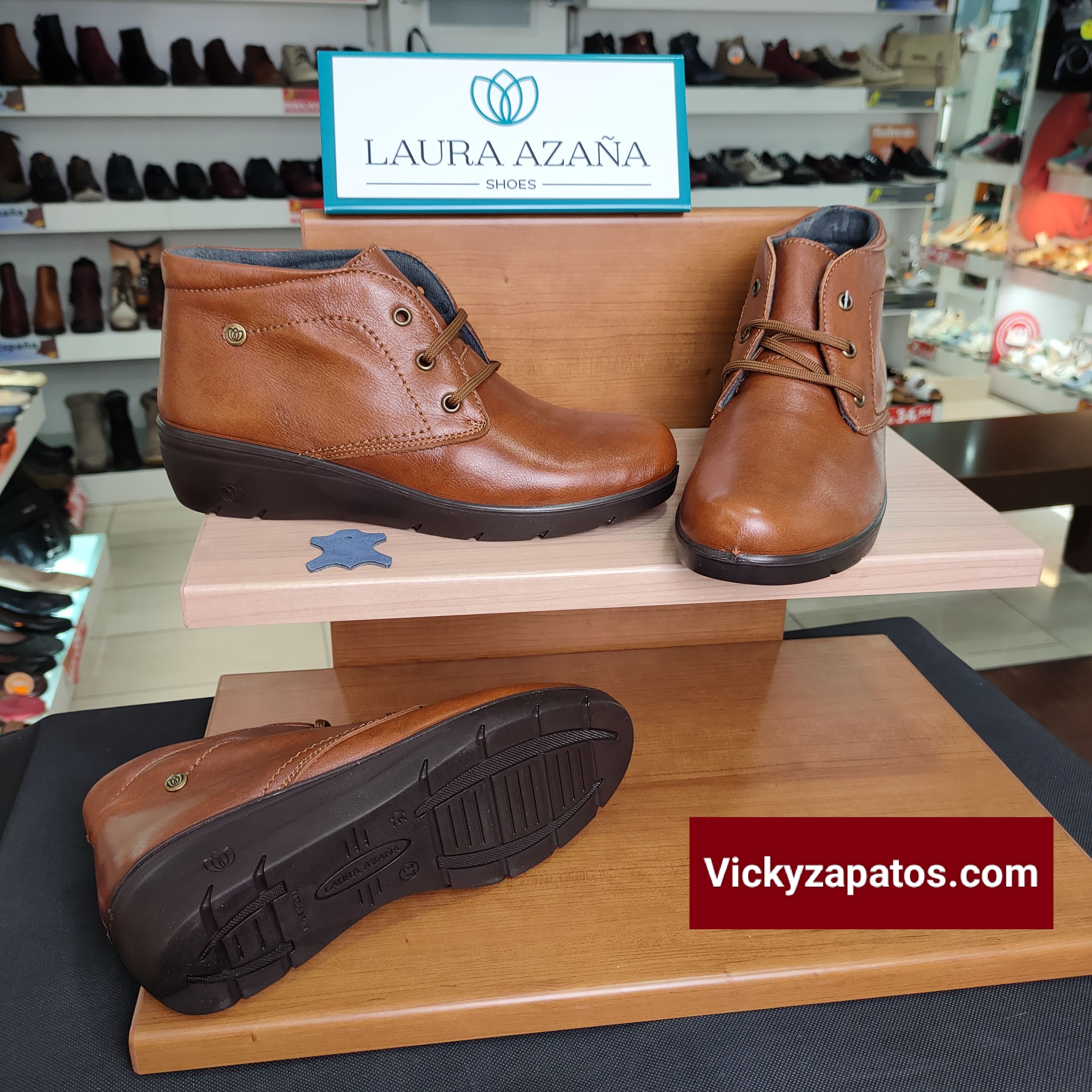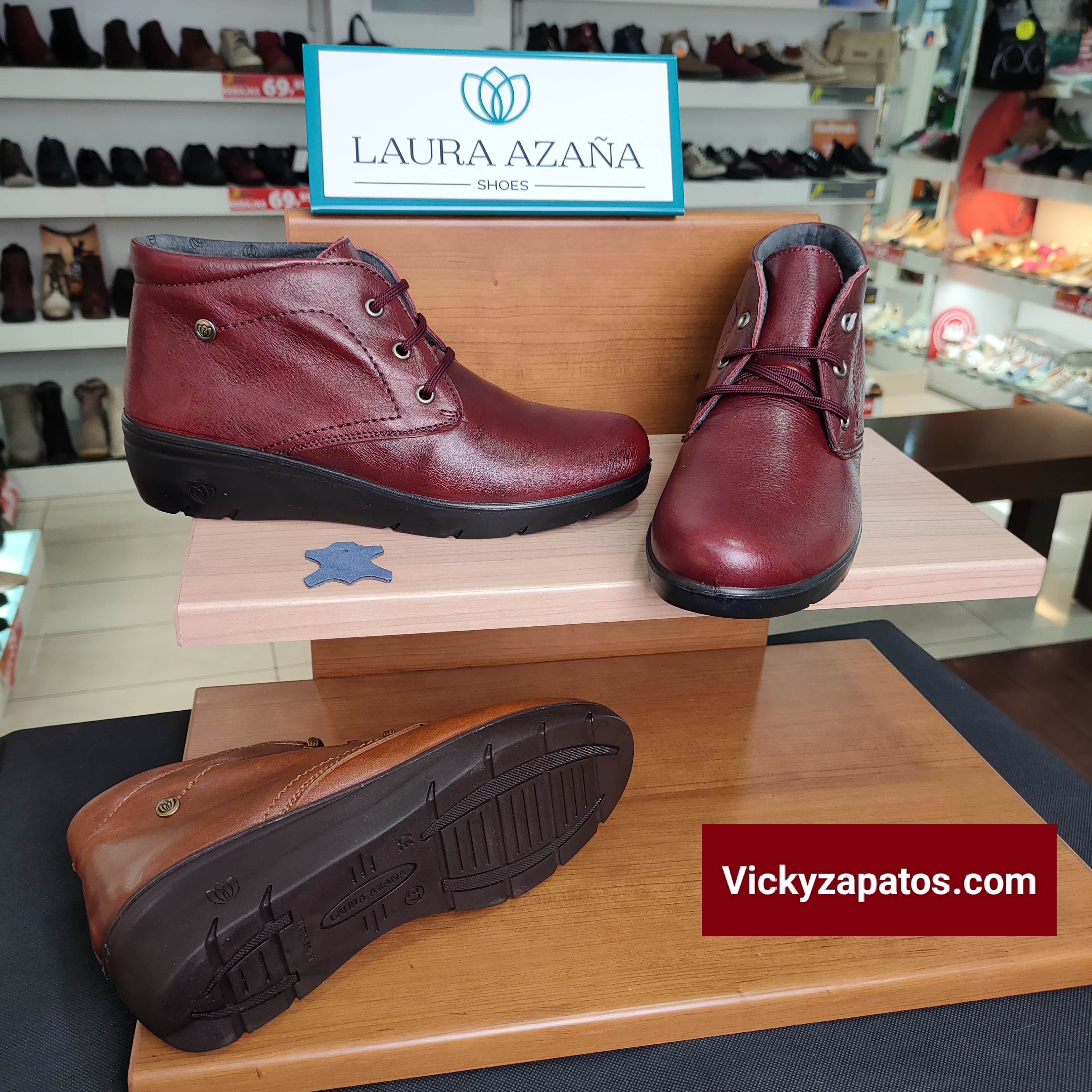 LAURA AZAÑA: Botín Confort disponible en Dos Colores: Rojo y Cuero con Cordón, Todo en Piel con Plantilla Extraíble, Forro Textil y Piso de Cuña Baja Hechas en España