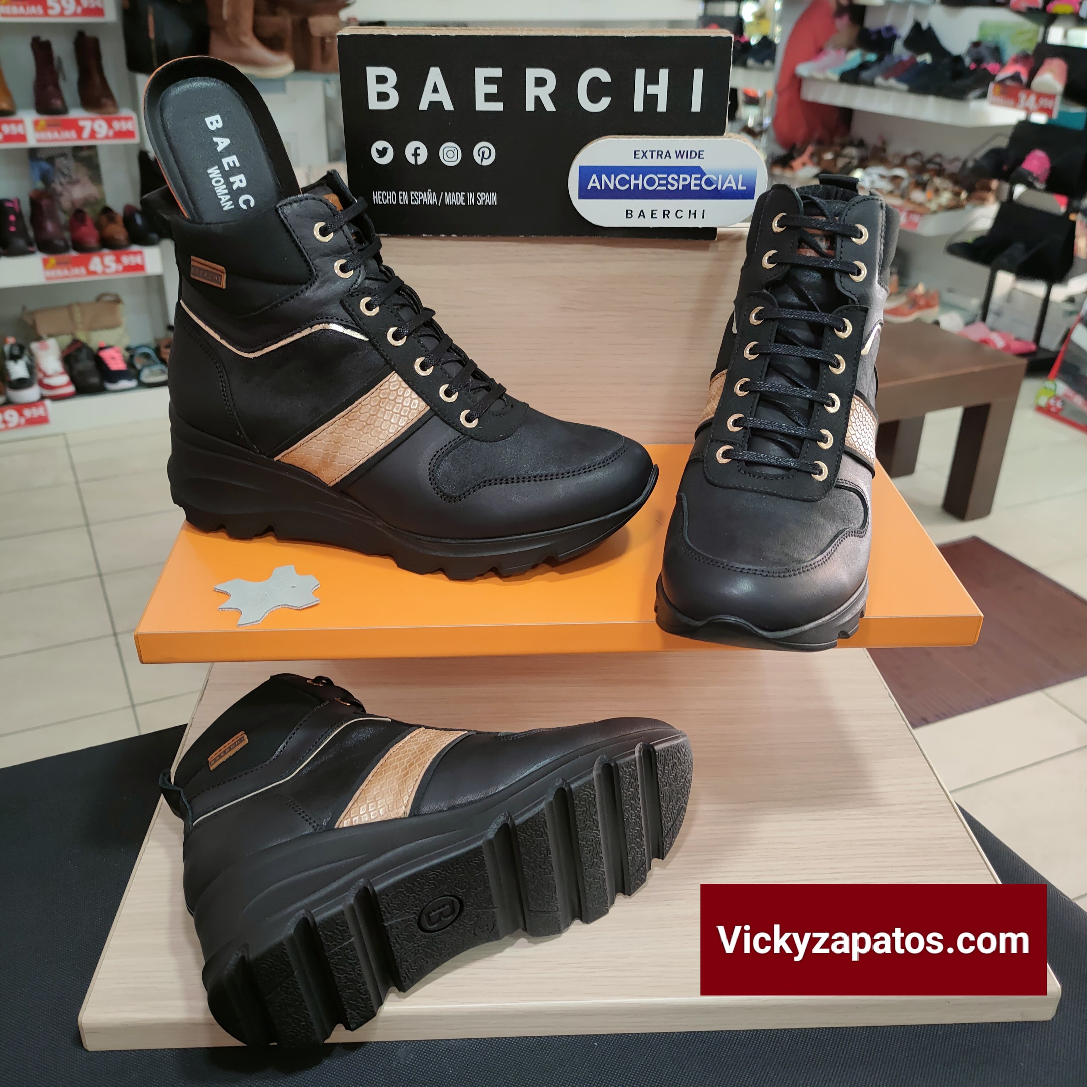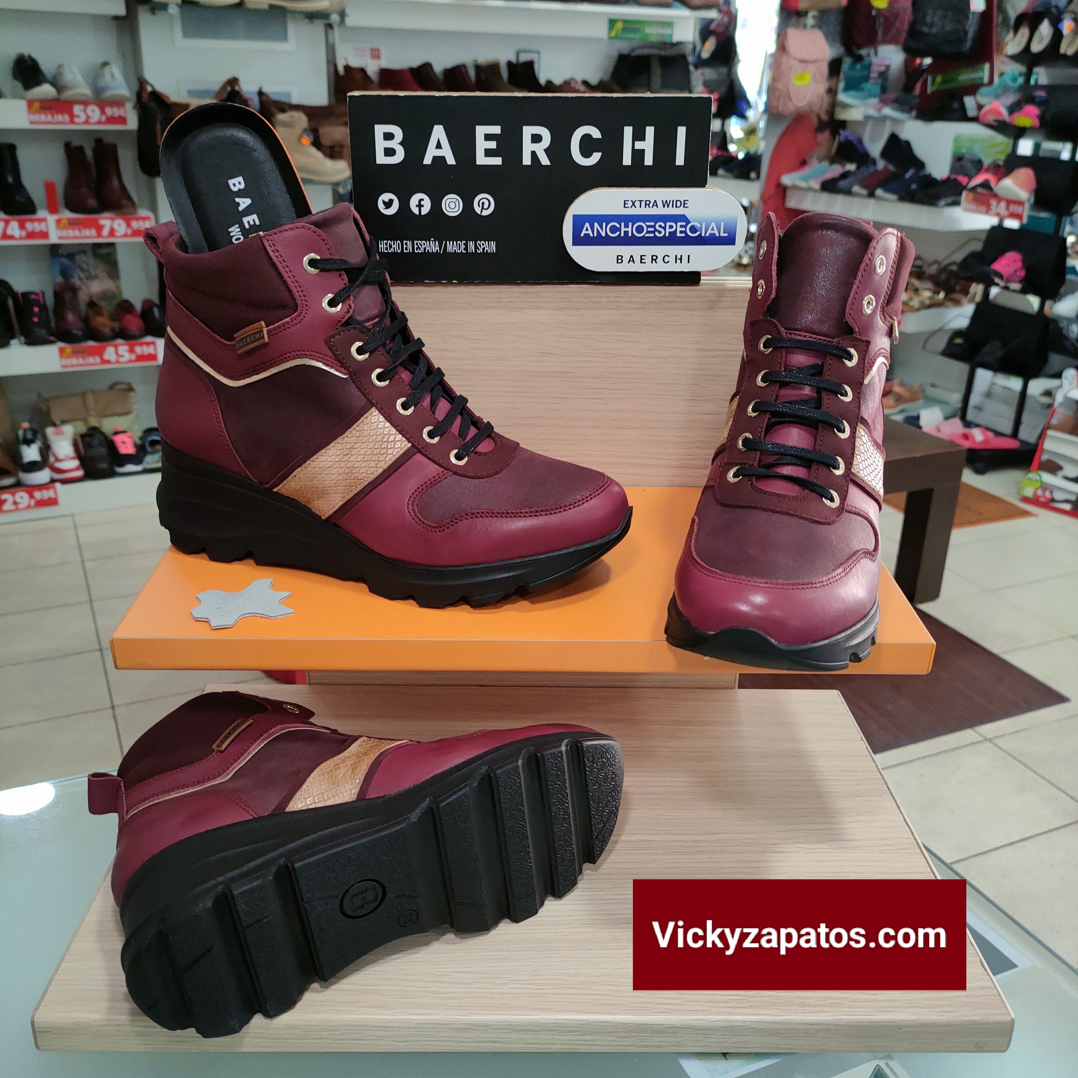 BAERCHI woman: Botín de piel combinado con reptil, disponible en dos colores: Negro y Burdeos, dispone de cordón y cremallera lateral para máximo ajuste y confort, forro Textil, Ancho Especial con plantilla Extraíble piso de cuña media con plataforma en color negro, Hecho en España Todo Moda