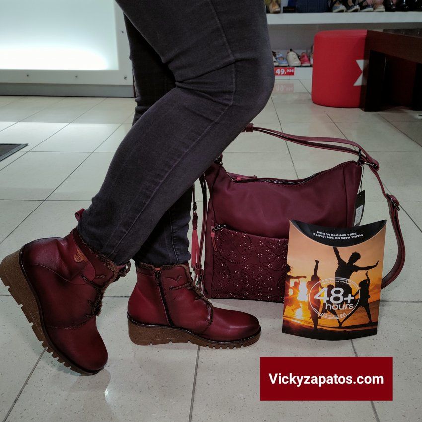 48+hours: Botín de piel cepillada con cremallera y córdon para un facil uso, con forro de pelo y plantilla extraíble, disponible en dos colores: Hielo y Burdeos, piso de cuña media de caucho con plataforma, máximo confort Hechas en España