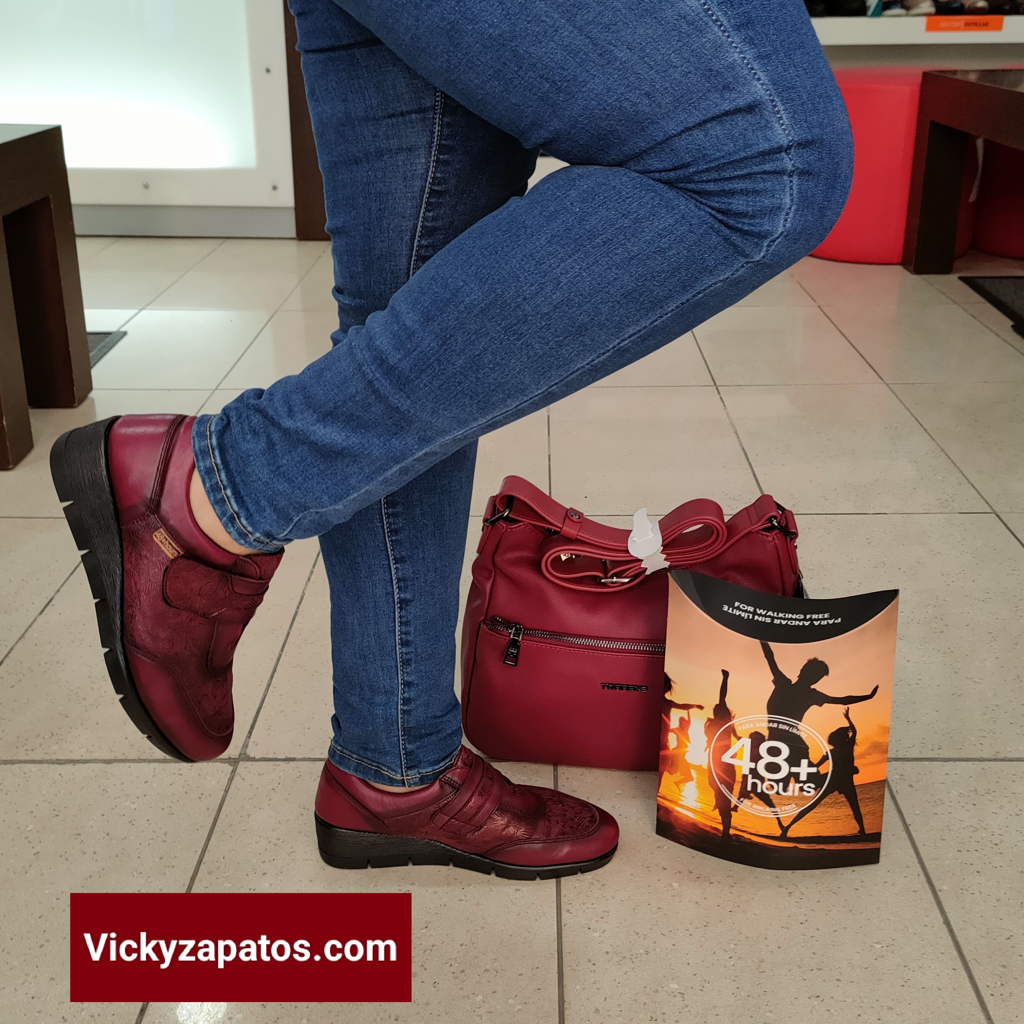48+Hours: Deportivo Casual de Piel Combinada en Lisa con grabado, con una tira de Velcro, Piso de Cuña Baja Ultra Light, disponibles en dos colores: Negro y Burdeos, Nueva temporada Marcas España