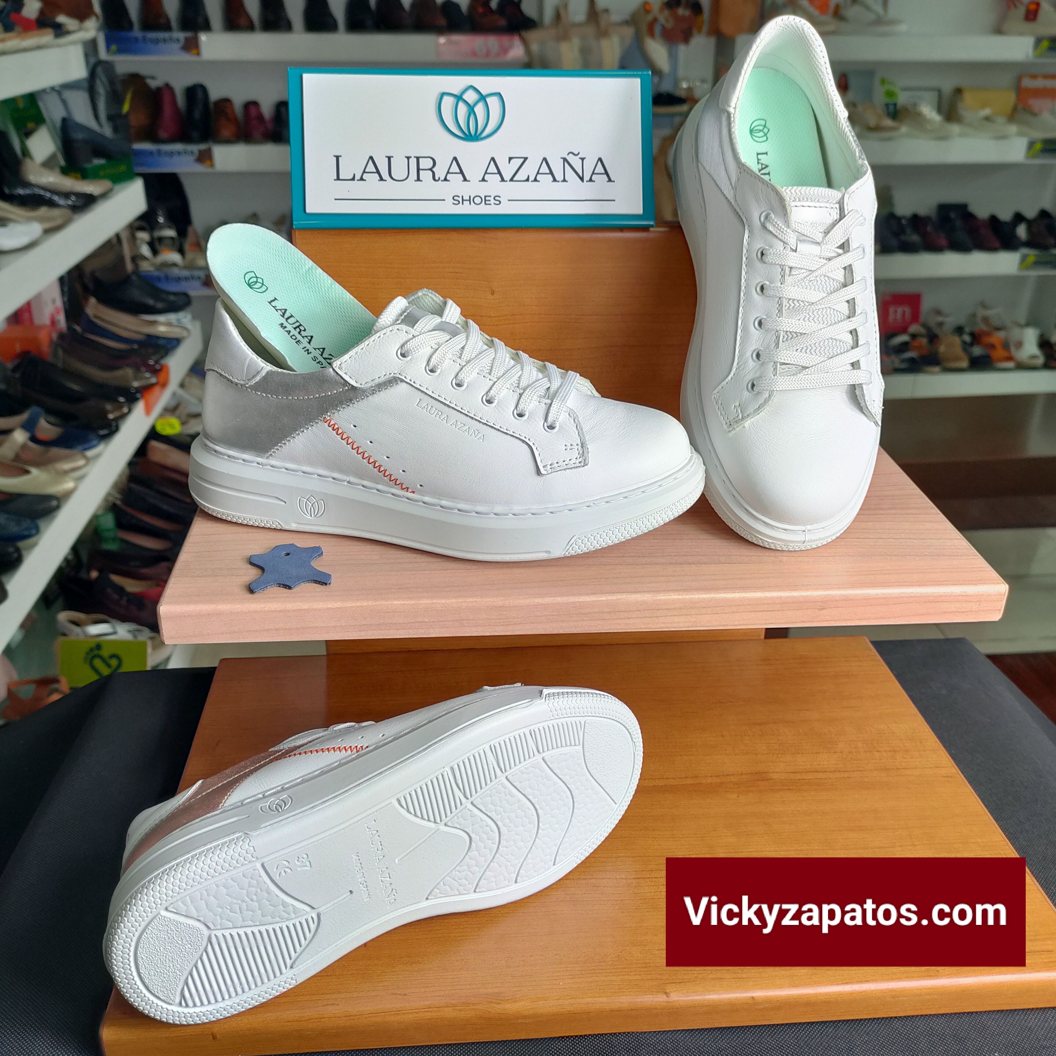 LAURA AZAÑA: Deportiva casual de piel con cordón en Dos Colores: Blanco/Plata y Blanco/Bronce, con plantilla de memory foam extraíble, pisos de plataforma blancos en caucho, con la calidad y diseño del calzado Hechos en España