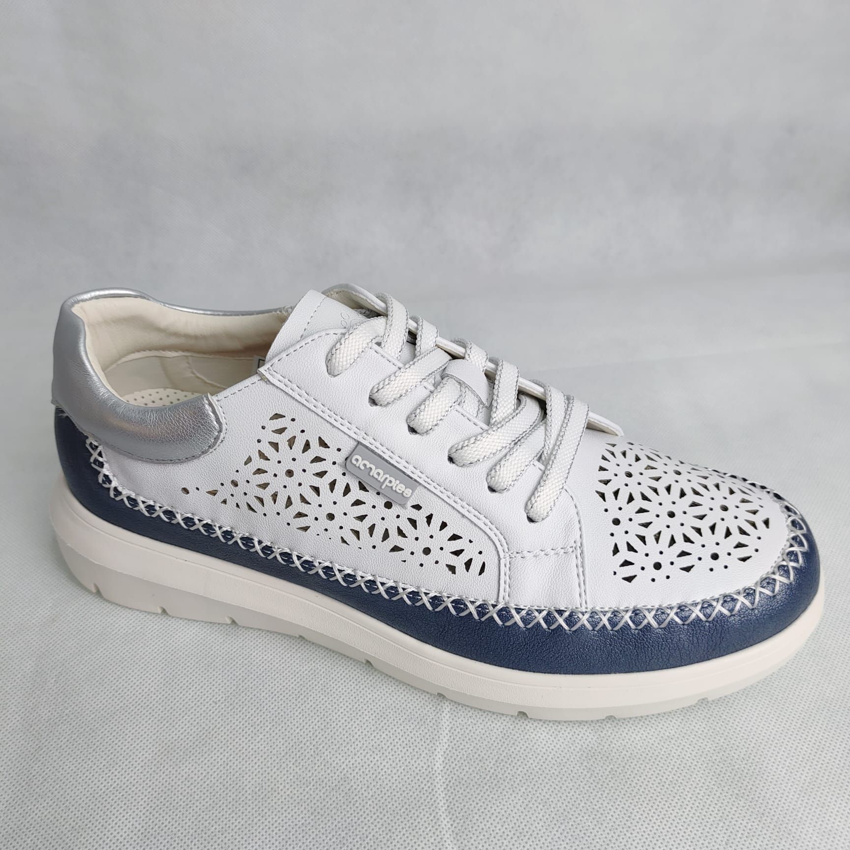 La pala y los laterales presentan acabado calado en blanco, aportando mayor frescura y un toque actual. La trasera y la unión con el piso en color jeans, junto al pespunte cosido tipo guante, refuerzan su diseño y aportan mayor flexibilidad y durabilidad.