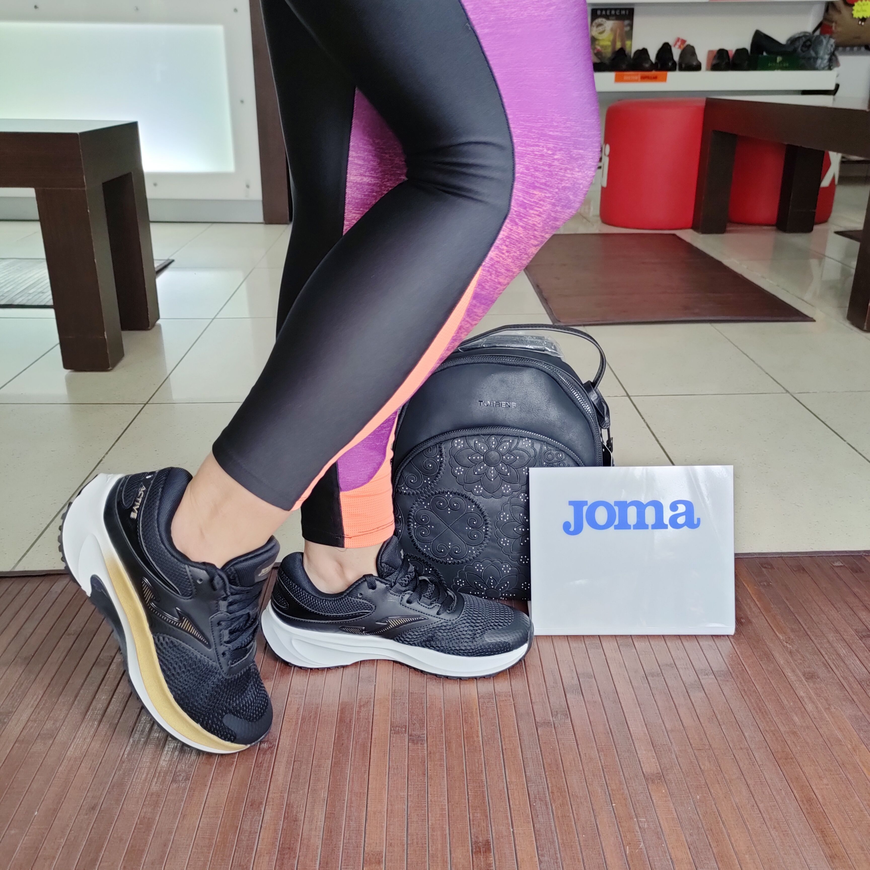 Zapatilla de running Joma Active Lady 2501 para mujer en color negro y oro. Tejido nailon transpirable, piso ligero con pastillas antideslizantes. Marca España. Tallas 36-41.