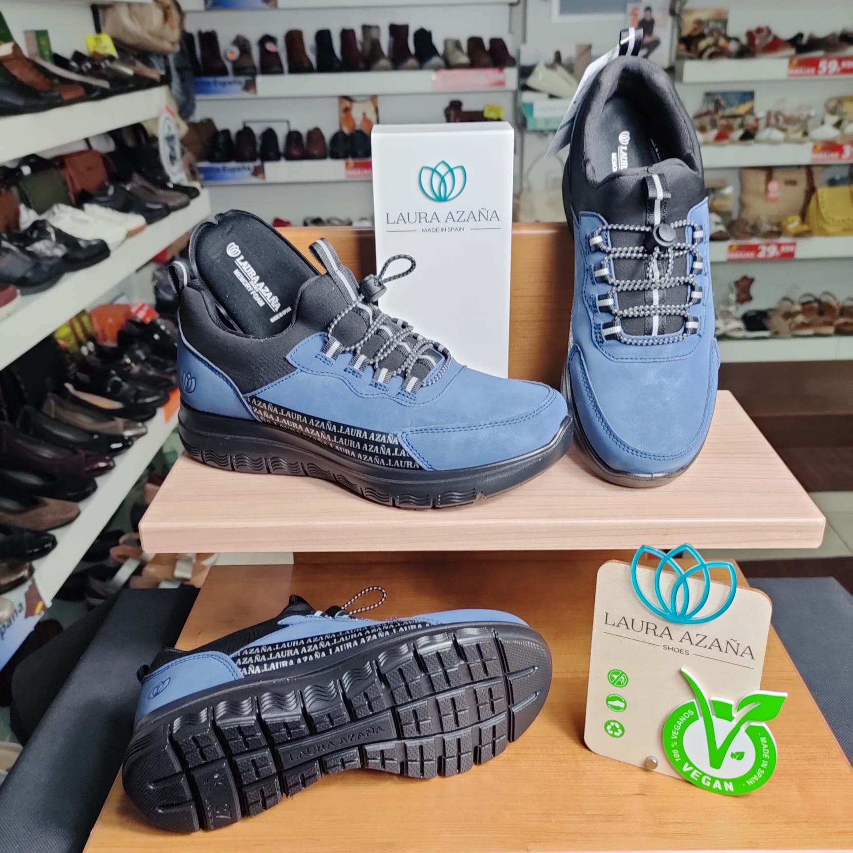 Deportivo Laura Azaña 26610 vegano para mujer, con cordón elástico ajustable, plantilla extraíble y piso de caucho antideslizante. Disponible en marino y negro combinado. Hechos en España. Tallas 35-41.