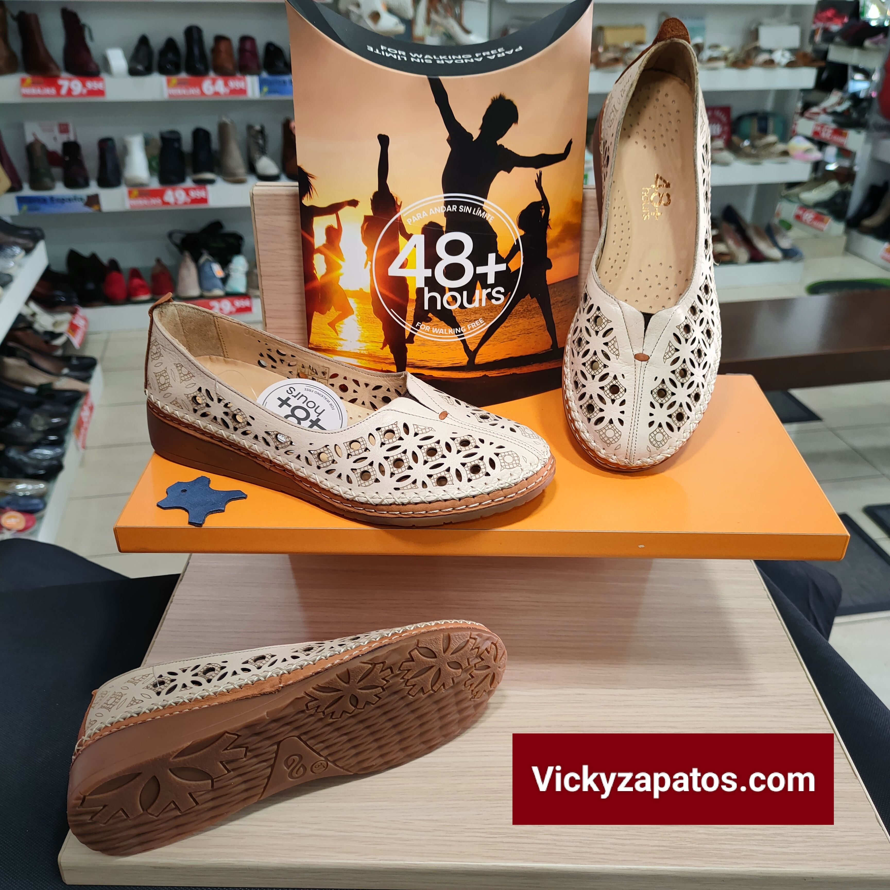 48+Hours: Manoletina de piel calada con apertura en empeine para mejorar el calce, disponible en dos colores: Beige y Marino con grabados y cosidos, piso de cuña baja con plataforma de caucho y plantilla extraíble, Máximo Confort Hecho en España