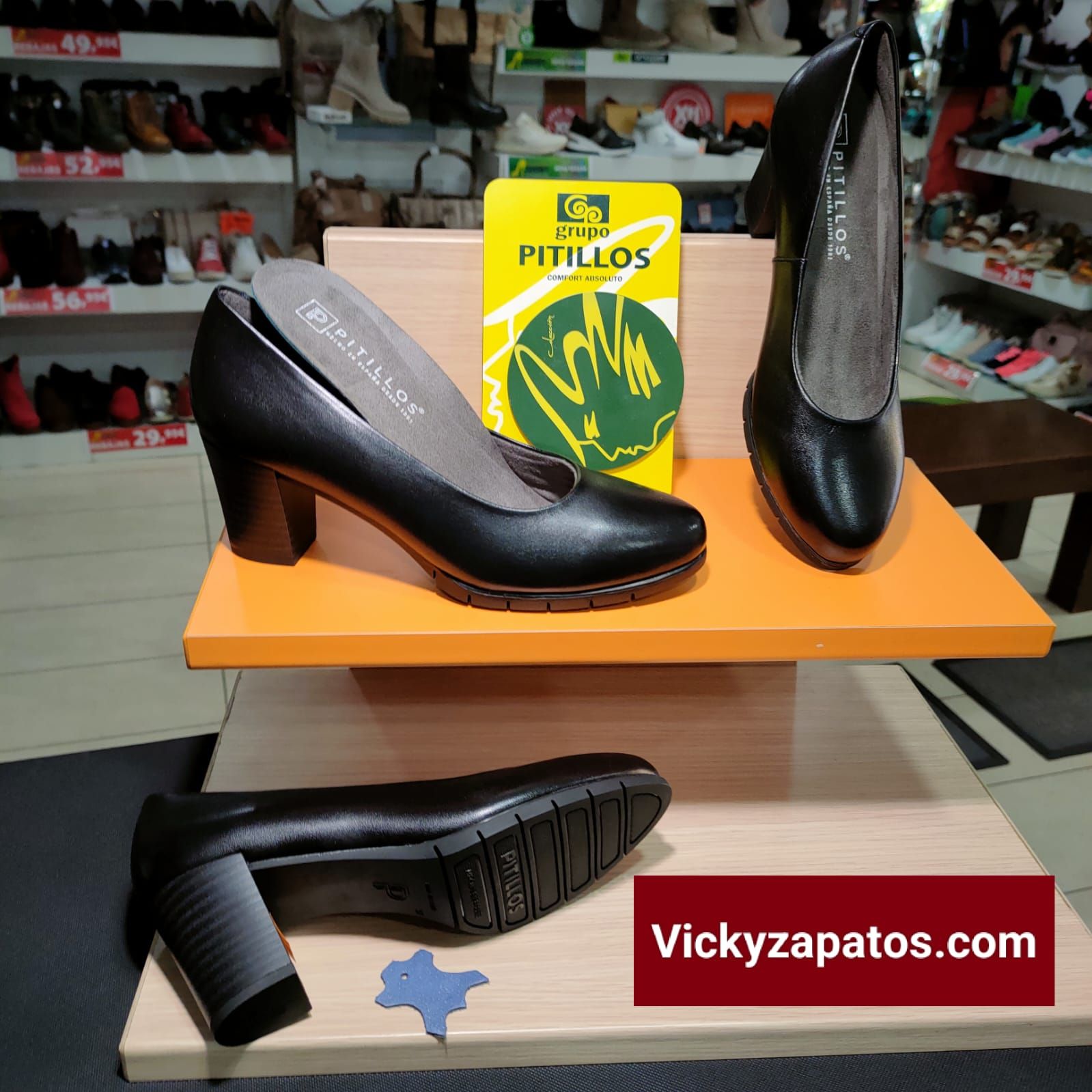 PITILLOS: Salón de piel lisa en color Negro, Plantilla Extraíble, Tacón Medio Ancho con plataforma, máximo confort y calidad Hechos en España
