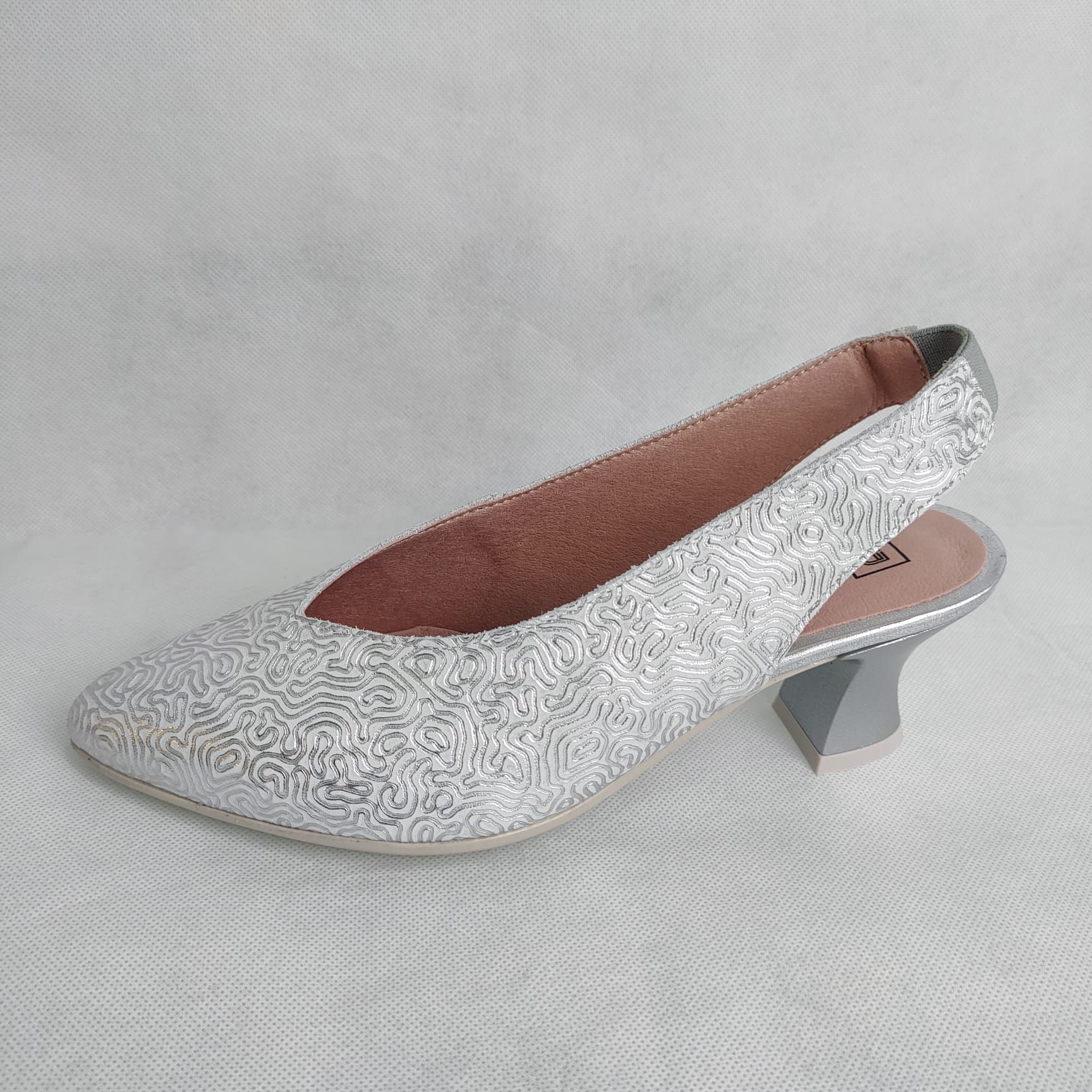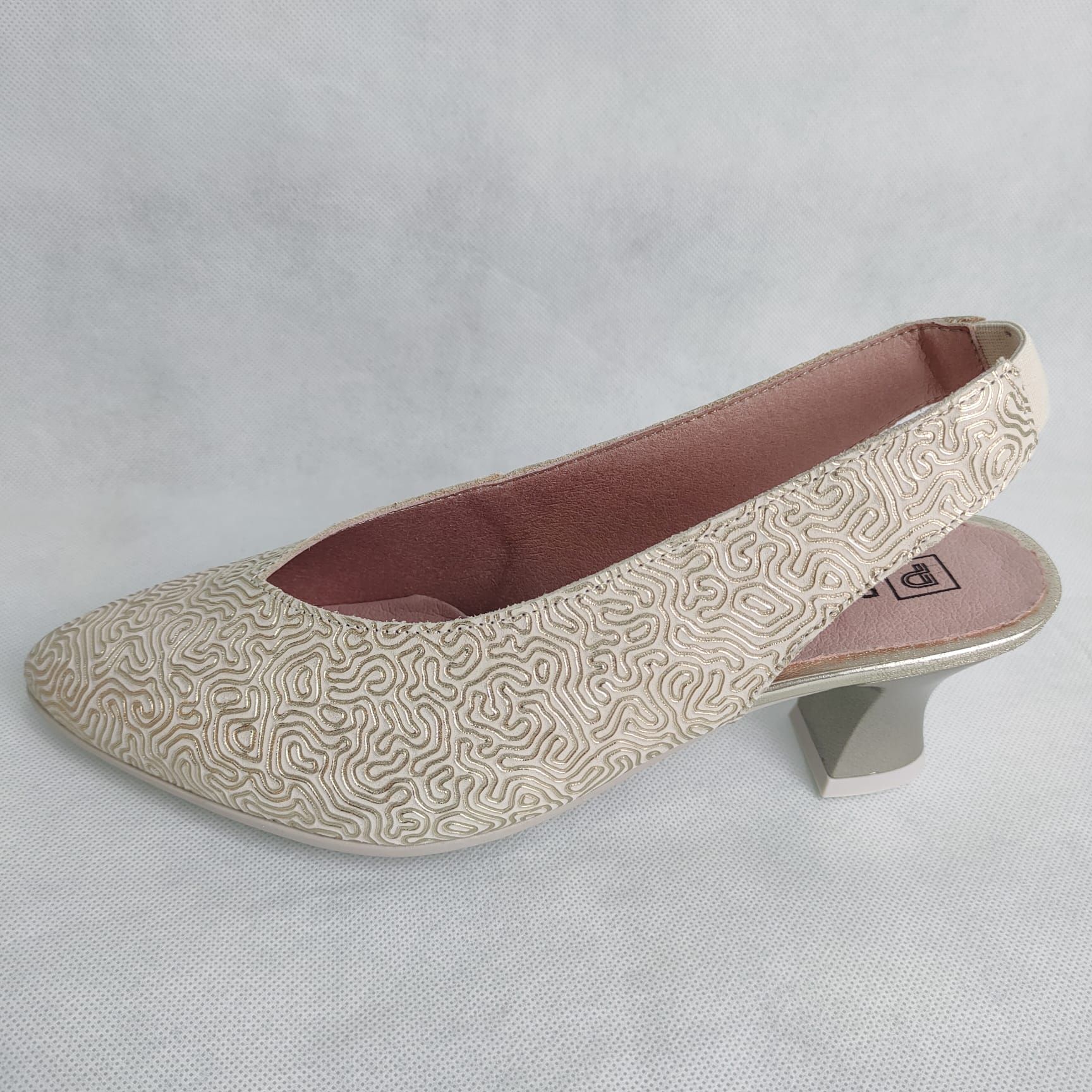 Elegante salón destalonado en piel grabada metalizada disponible en oro y plata, con tacón medio ancho tipo carrete y suela antideslizante. Hecho en España.
