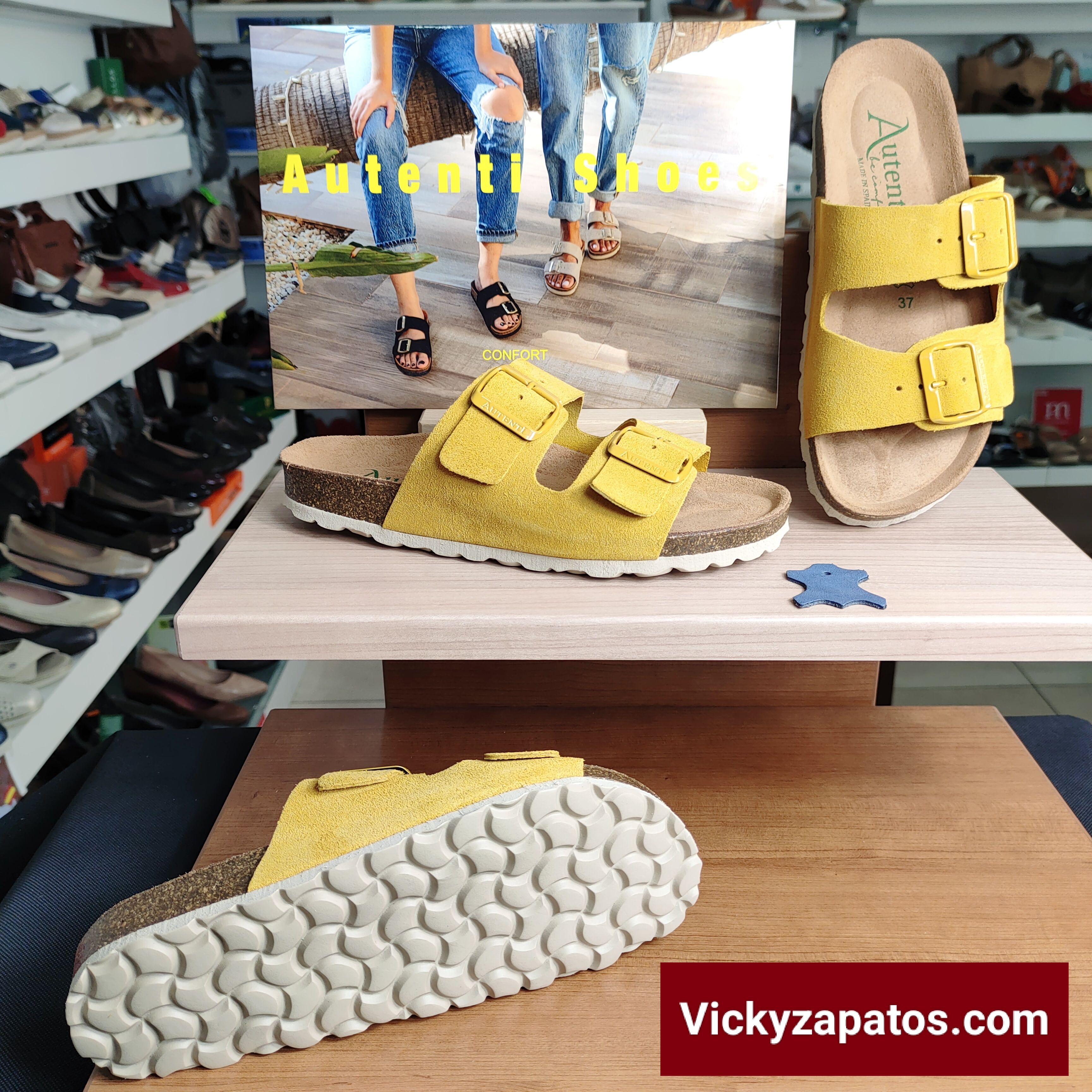 AUTENTI Be Confortable: Sandalia en Piel Afelpada Con Dos Tiras con Hebilla Ajustable Piso de Corcho Natural BIO, Disponible en Color: Mostaza, Todas Hechas en España