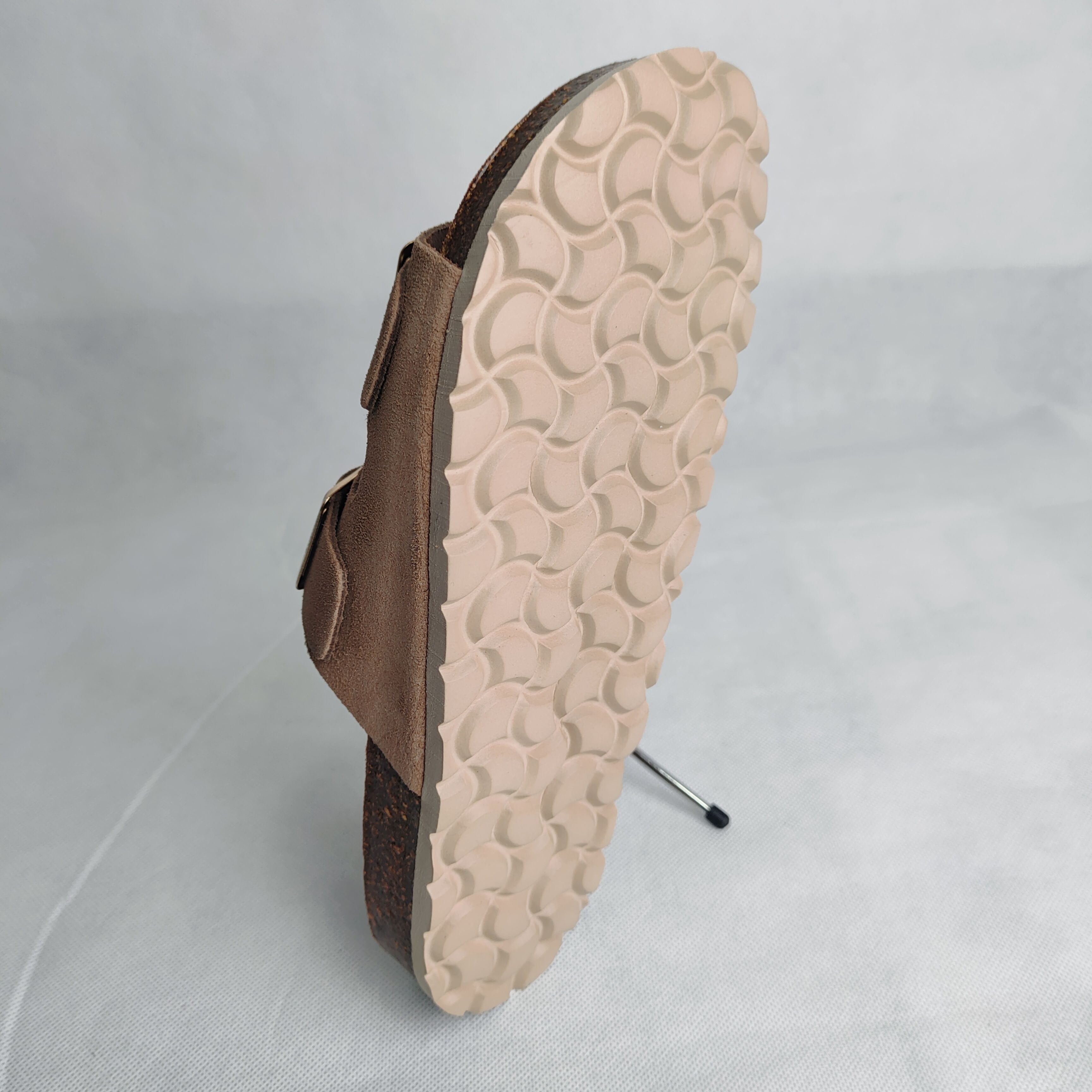 La base de corcho natural antibacteriano, combinada con caucho, aporta ligereza, flexibilidad y durabilidad, favoreciendo el movimiento natural del pie y ayudando a prevenir molestias plantares.