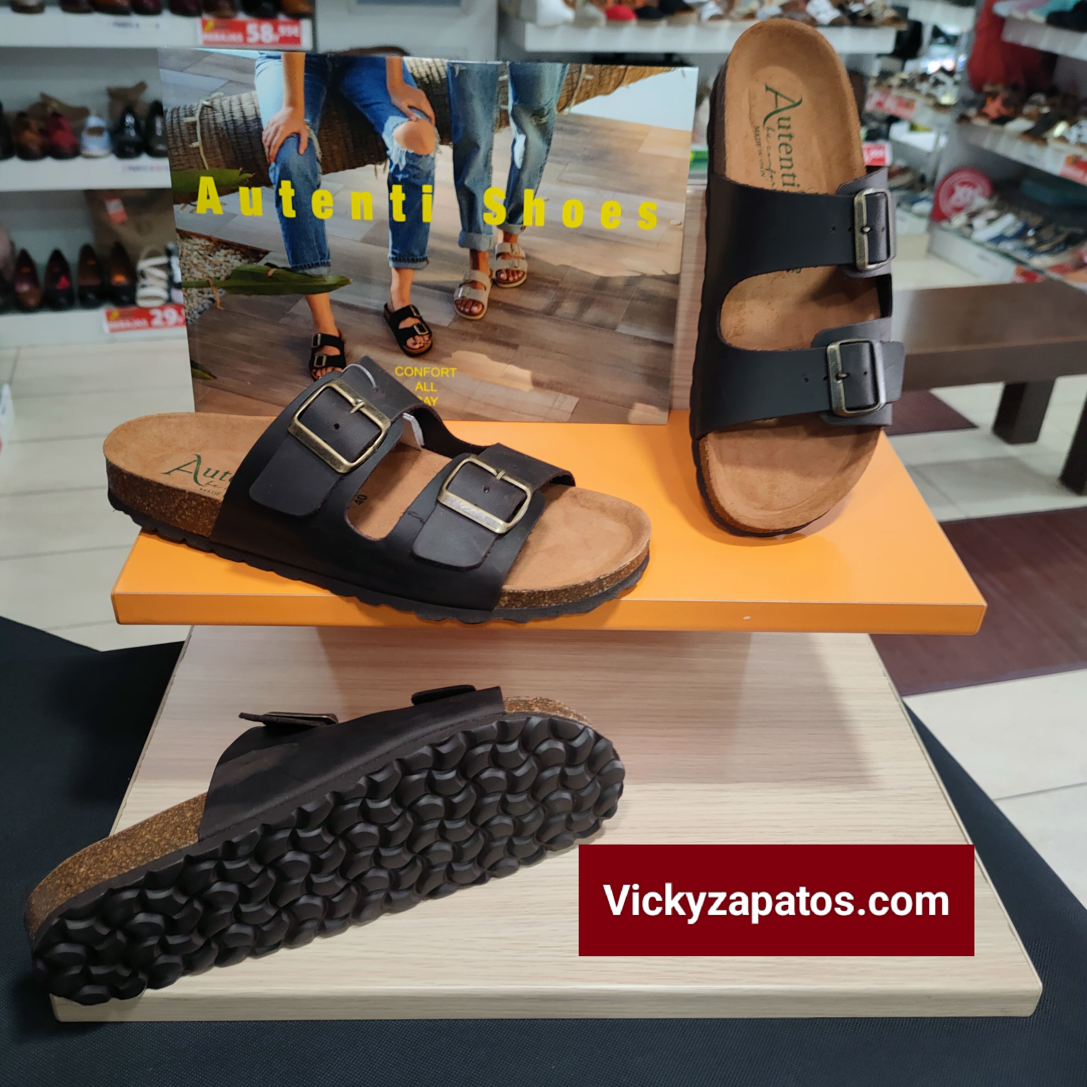 AUTENTI Be Confortable: Sandalia en Piel Con Dos Tiras con Hebilla Ajustable Piso de Corcho Natural BIO, Disponible en Colores: Marrón Chocolate, Todas Hechas en España
