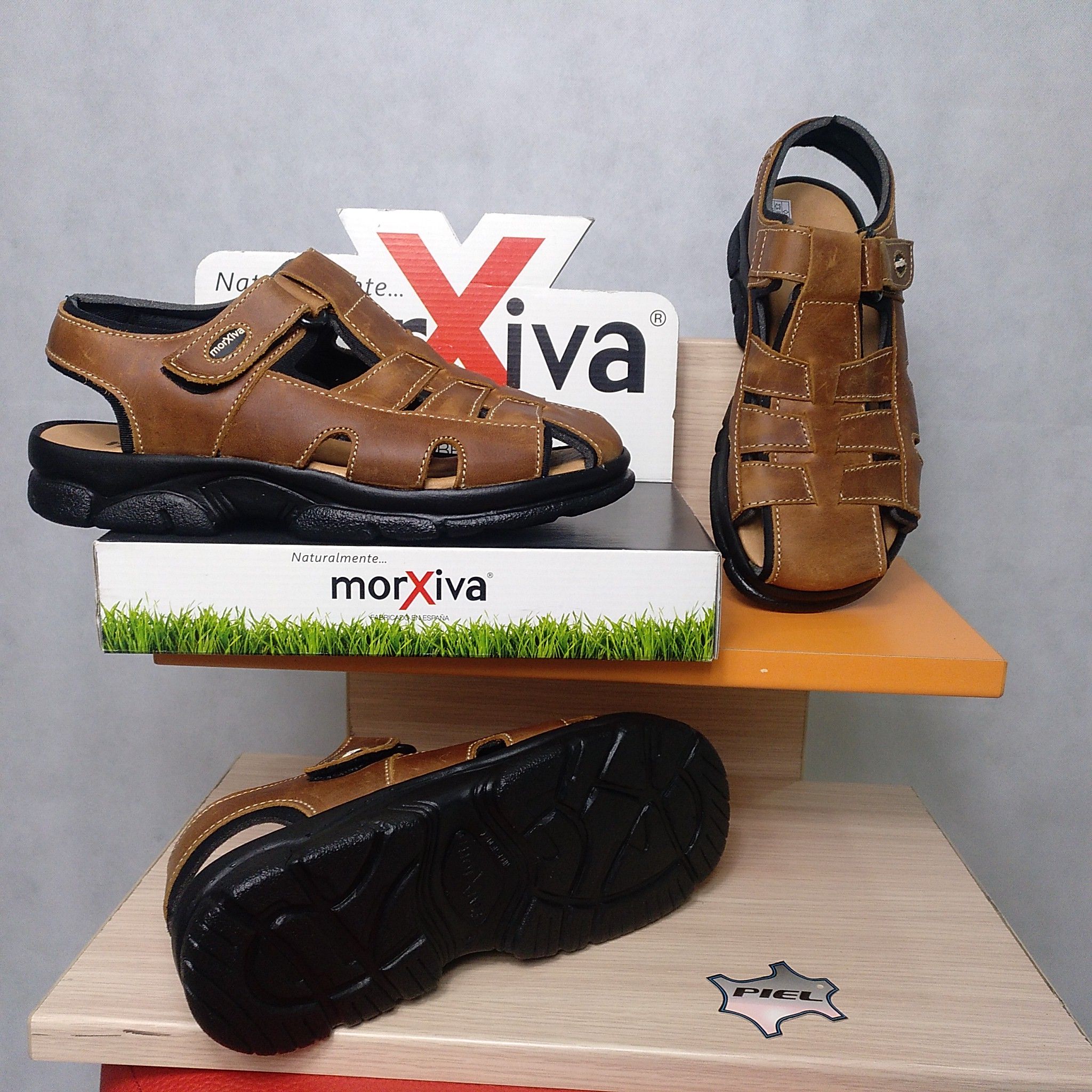 MORXIVA: sandalia con velcro y puntera cerrada, color cuero toda en piel con forro de esponja y textil para sentir todo el pie acolchado con planta de gel y piso de poliuretano aligerado, fabricado en España