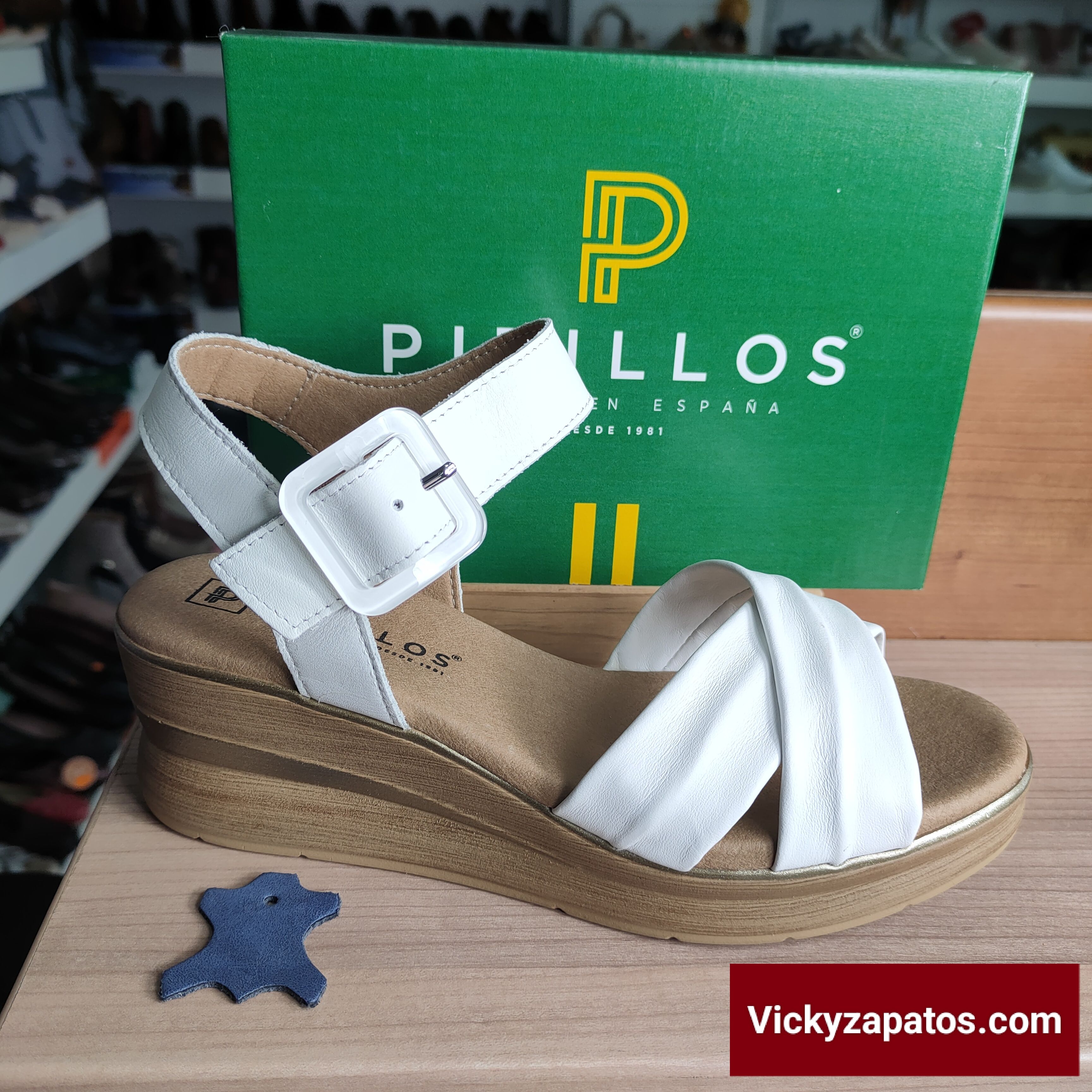 PITILLOS: Sandalia de Piel en color Blanco con Hebilla Ajustable al tono, Pala con Tiras Cruzadas en Piel Tubular, Piso de Cuña Media con Plataforma bicolor y planta de Gel, Todas Hechas en España