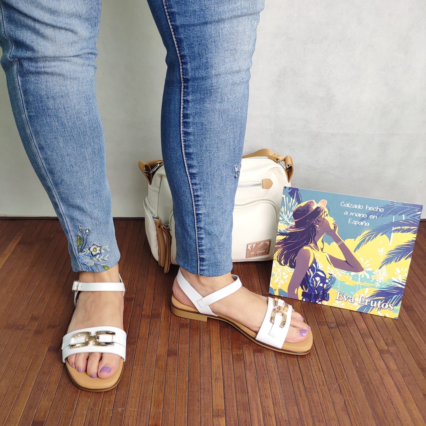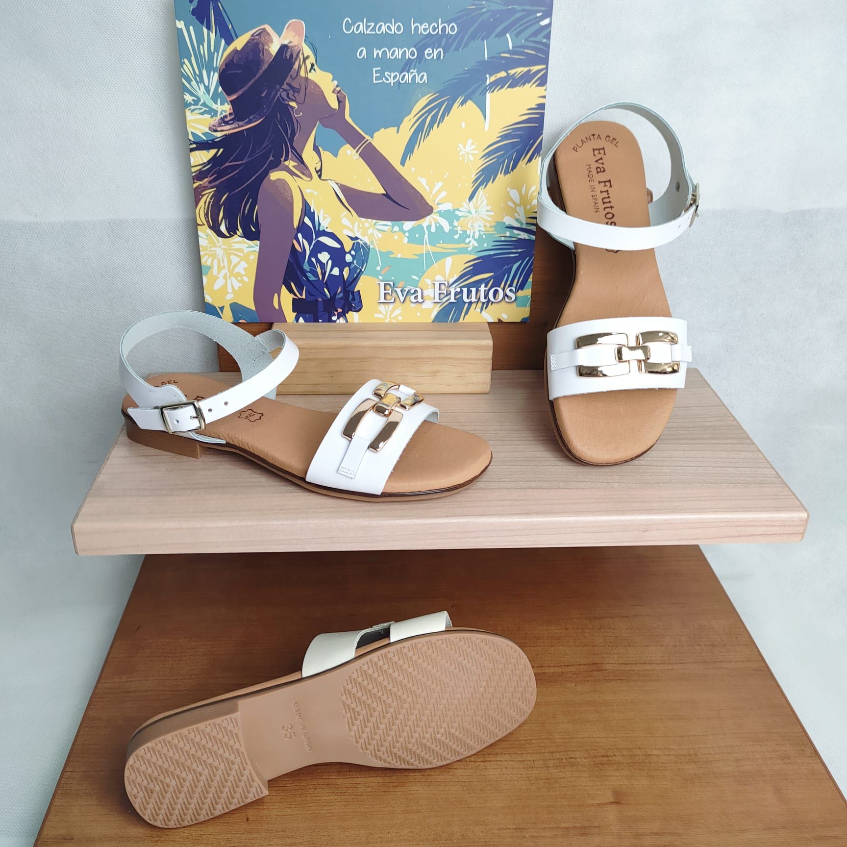 Sandalia de piel blanca con pulsera de hebilla, planta de gel y piso de caucho. Confort y calidad. Hecha en España. Tallas del 35 al 41.