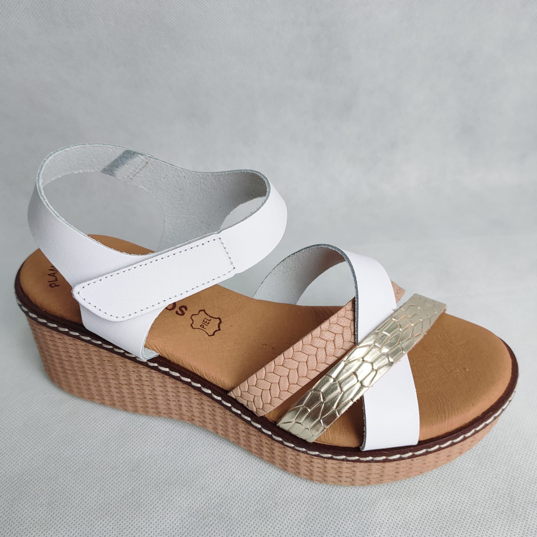 Disponible en color blanco multi, incorpora tres tiras en la pala: una en piel blanca lisa y dos en tonos beige y oro metalizados, que aportan luminosidad y un toque sofisticado al conjunto. La pulsera trasera con cierre de velcro en color blanco facilita el ajuste y mejora la comodidad al caminar.