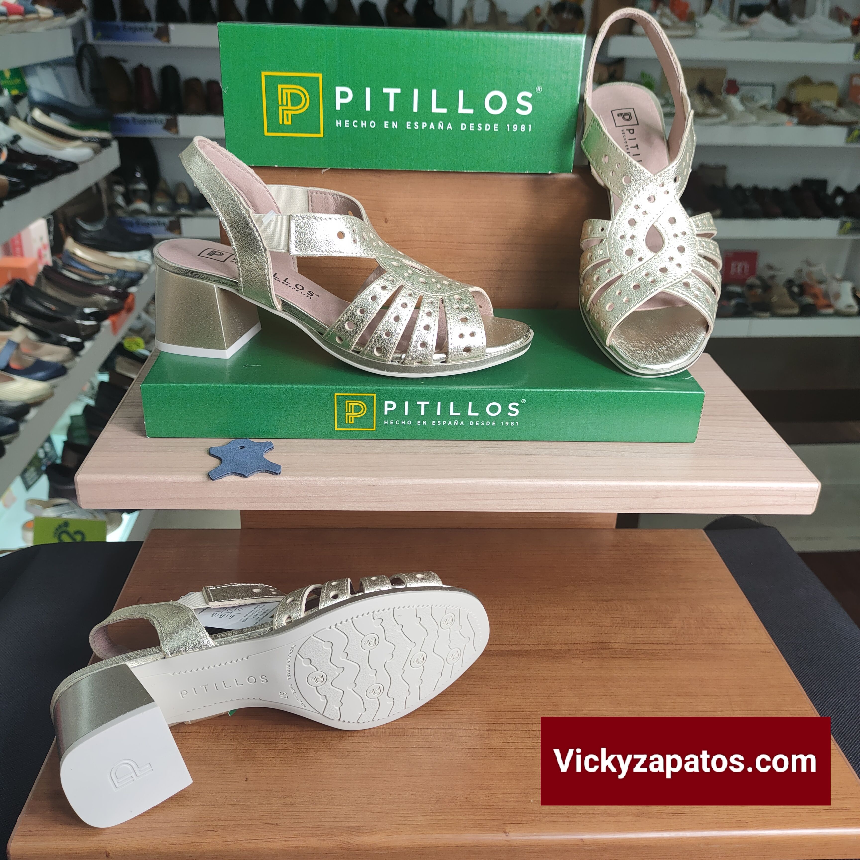 PITILLOS: Sandalia de piel metalizada con planta de gel, Disponible en Color: Oro, Tiras en pala en piel troquelada, trasera con Elástico en Color al tono, piso de Poliuretano Tacón Medio al tono, Hechas en España Calidad al Mejor Precio