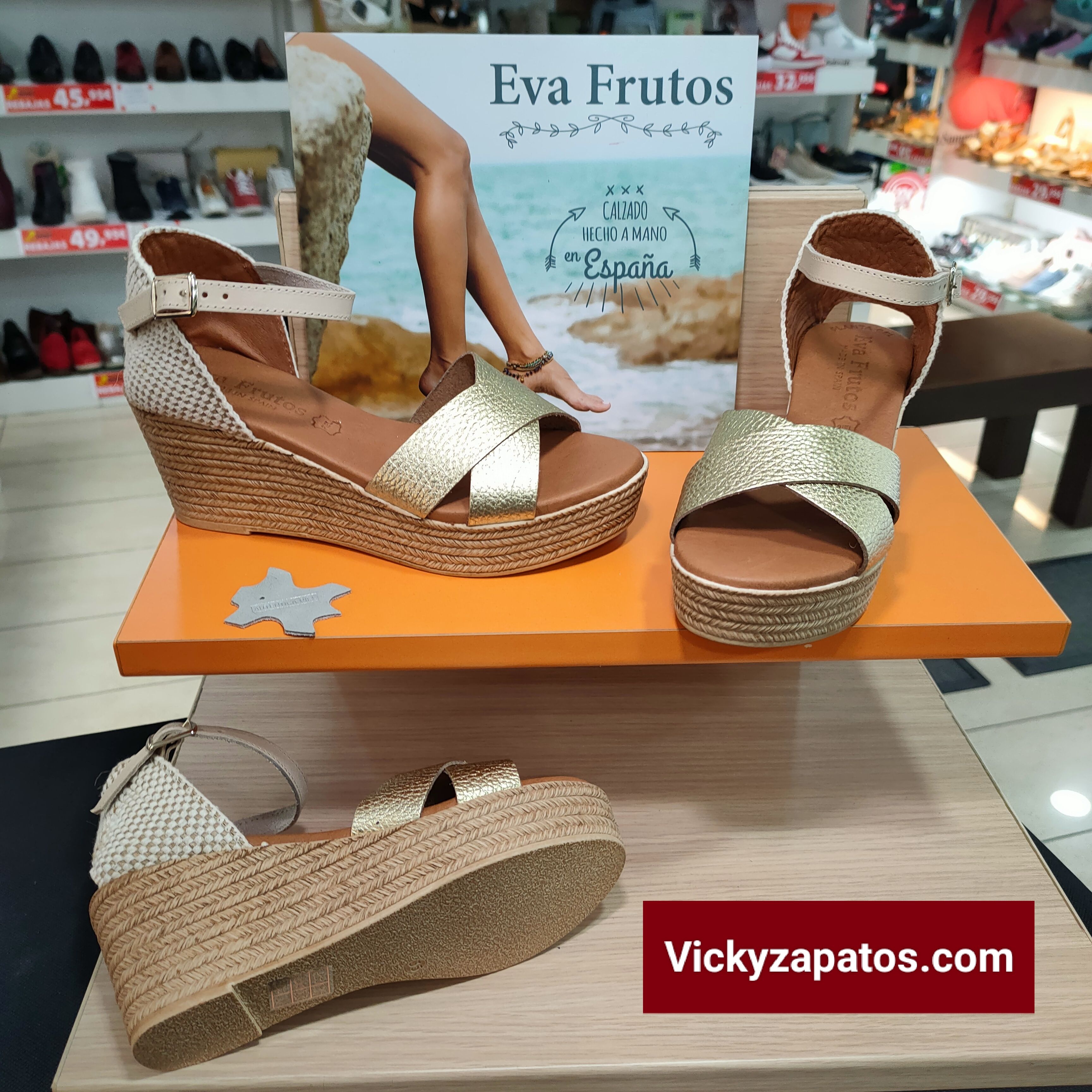 EVA FRUTOS: Sandalia de piel en color Dorado con tiras cruzadas en empeine y pulsera de hebilla con talonera de rafia, piso de cuña con plataforma imitando a las esparteñas, Hechas en España Calidad al Mejor Precio