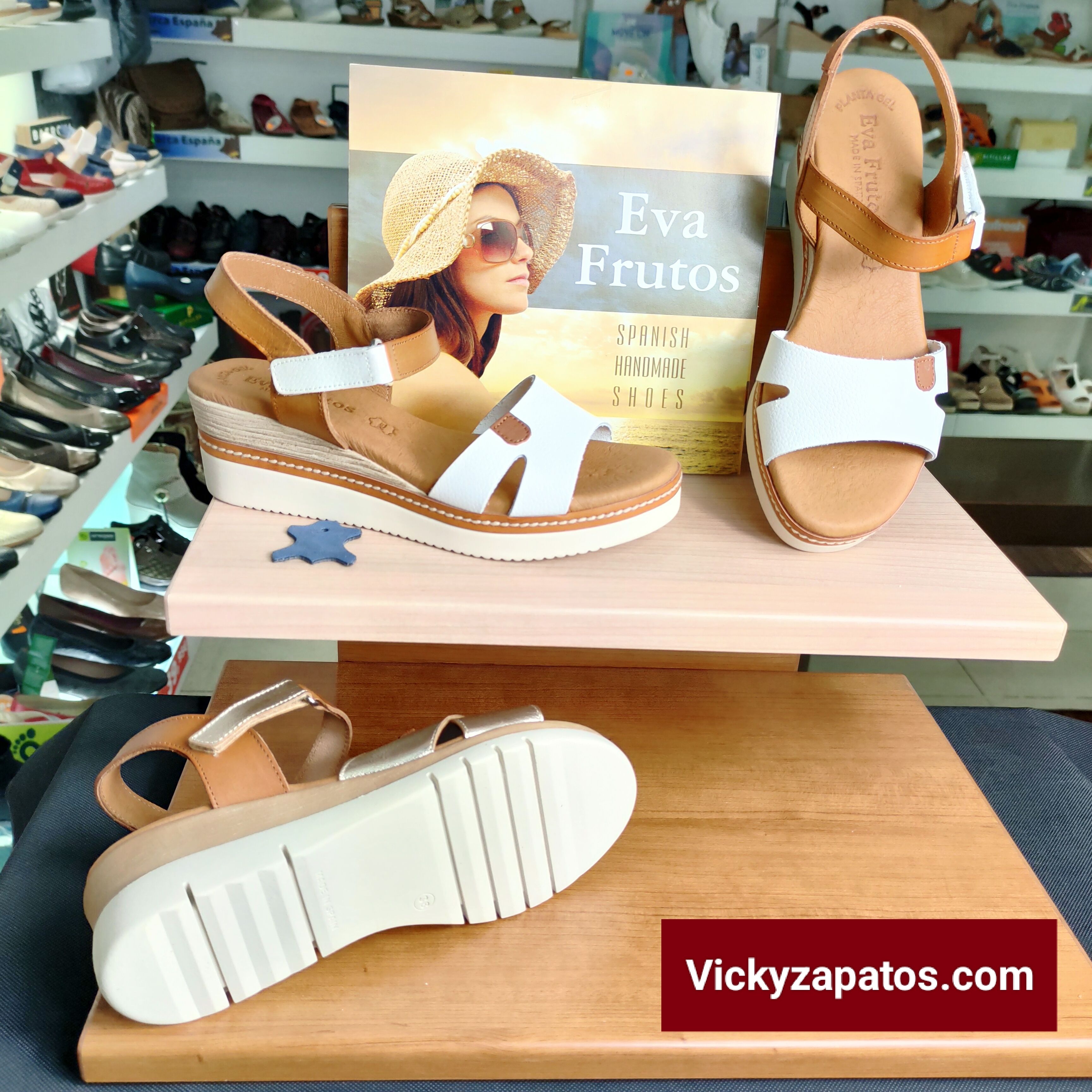 EVA FRUTOS: Sandalia de piel con planta de gel, Disponible en color Blanco en pala combinado en Cuero y Blanco en Trasera de Velcro, piso de Poliuretano cuña media con plataforma simulando madera, Hechas en España Calidad al Mejor Precio