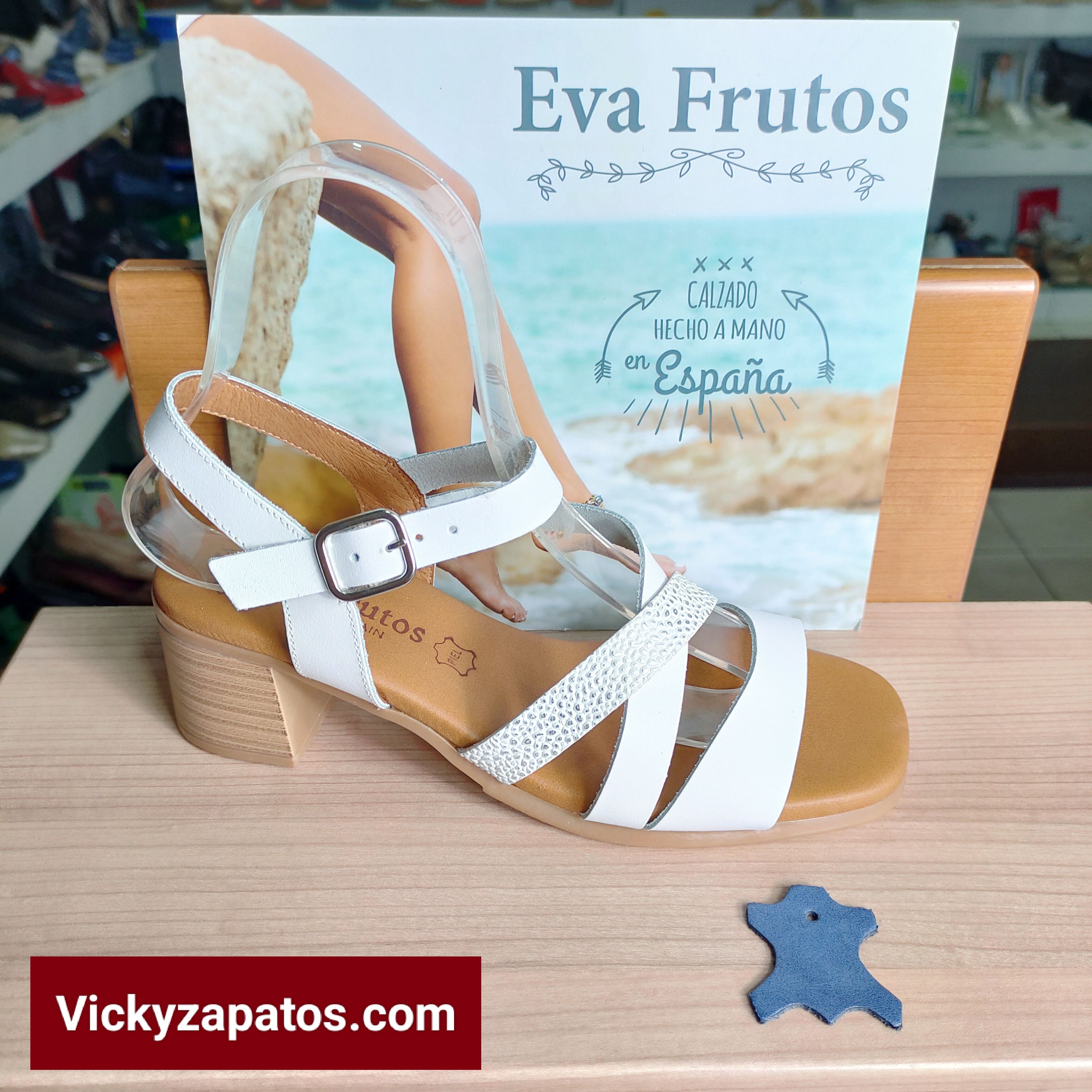 EVA FRUTOS: Sandalia de piel con planta de gel, Disponible en color Blanco-Plata: Tiras en pala combinadas en Blanco y Blanco-plata, pulsera y trasera de Hebilla, piso de Poliuretano Tacón Medio simulando madera, Hechas en España Calidad al Mejor Precio