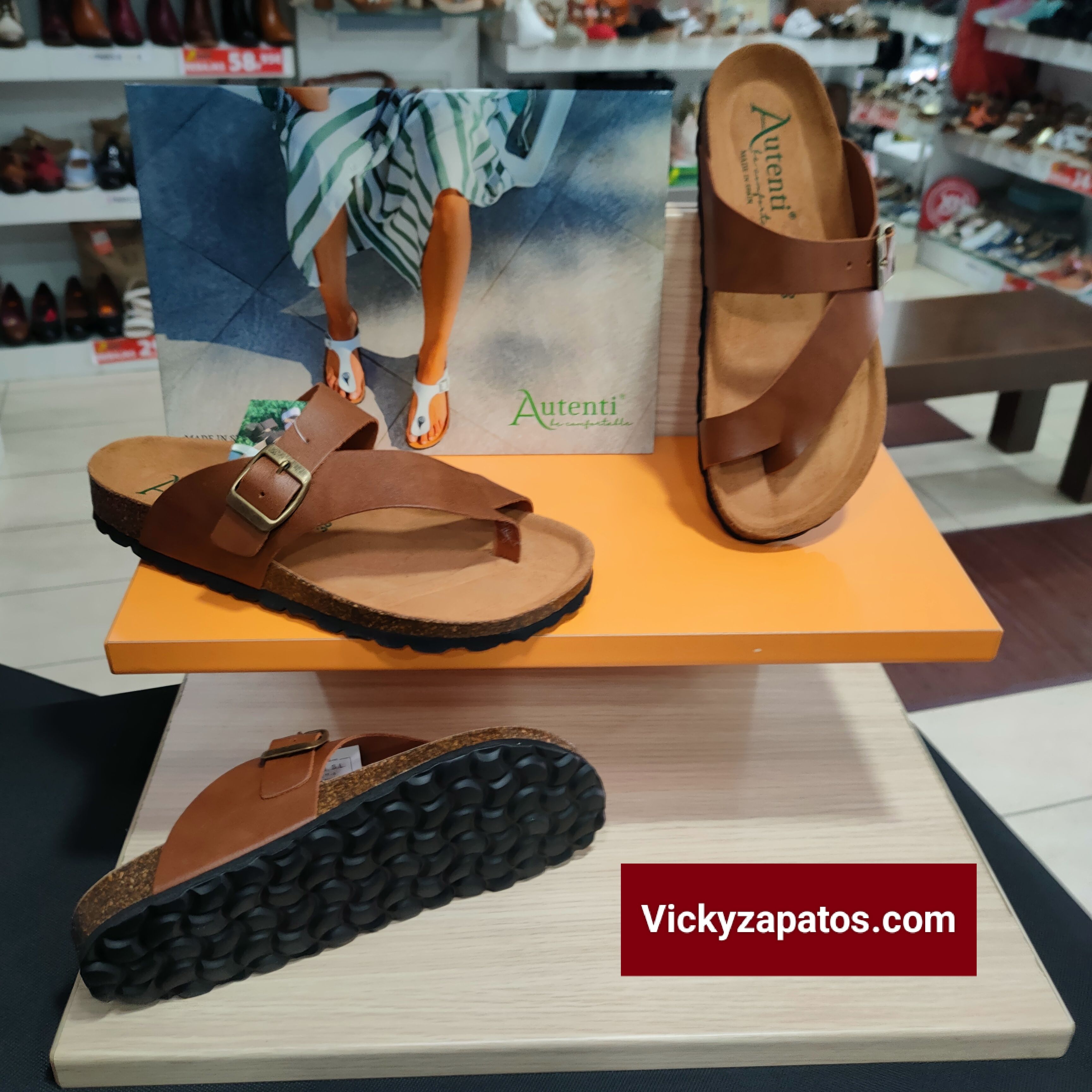 AUTENTI Be Confortable: Sandalia Esclava en Piel Napa Con Una Tira con Hebilla Ajustable Piso de Corcho Natural BIO, Disponible en Colores: Cuero, Todas Hechas en España