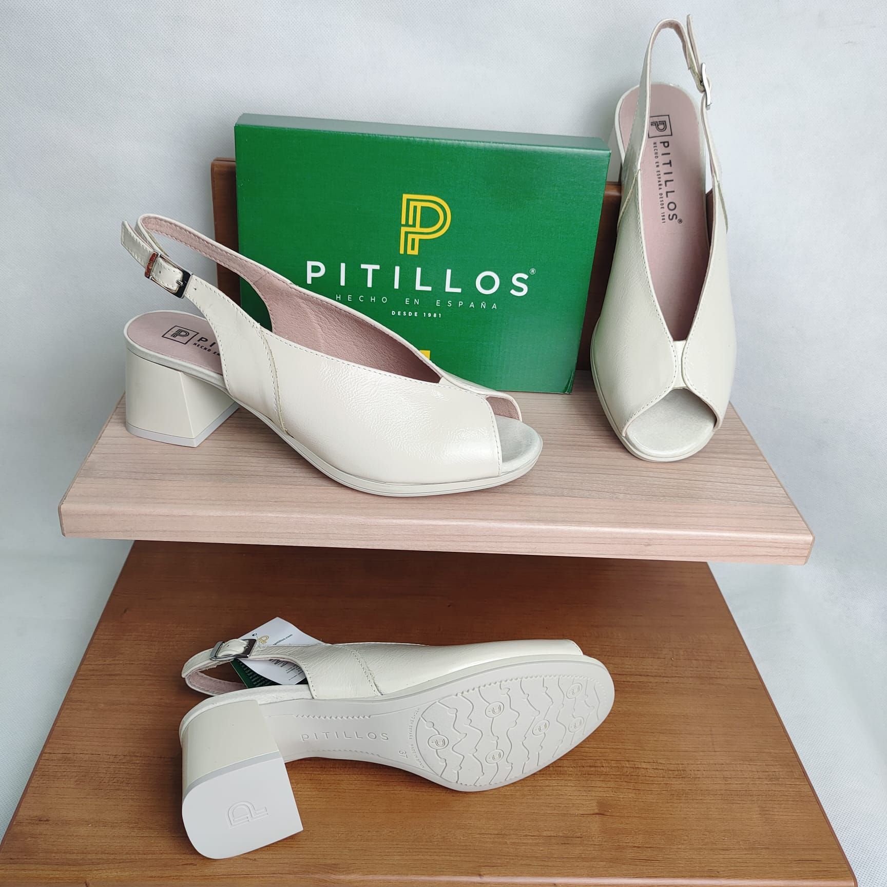 Sandalia elegante en charol crema con puntera y talón abiertos, tacón medio ancho y suela antideslizante. Confort y estilo de la marca Pitillos.