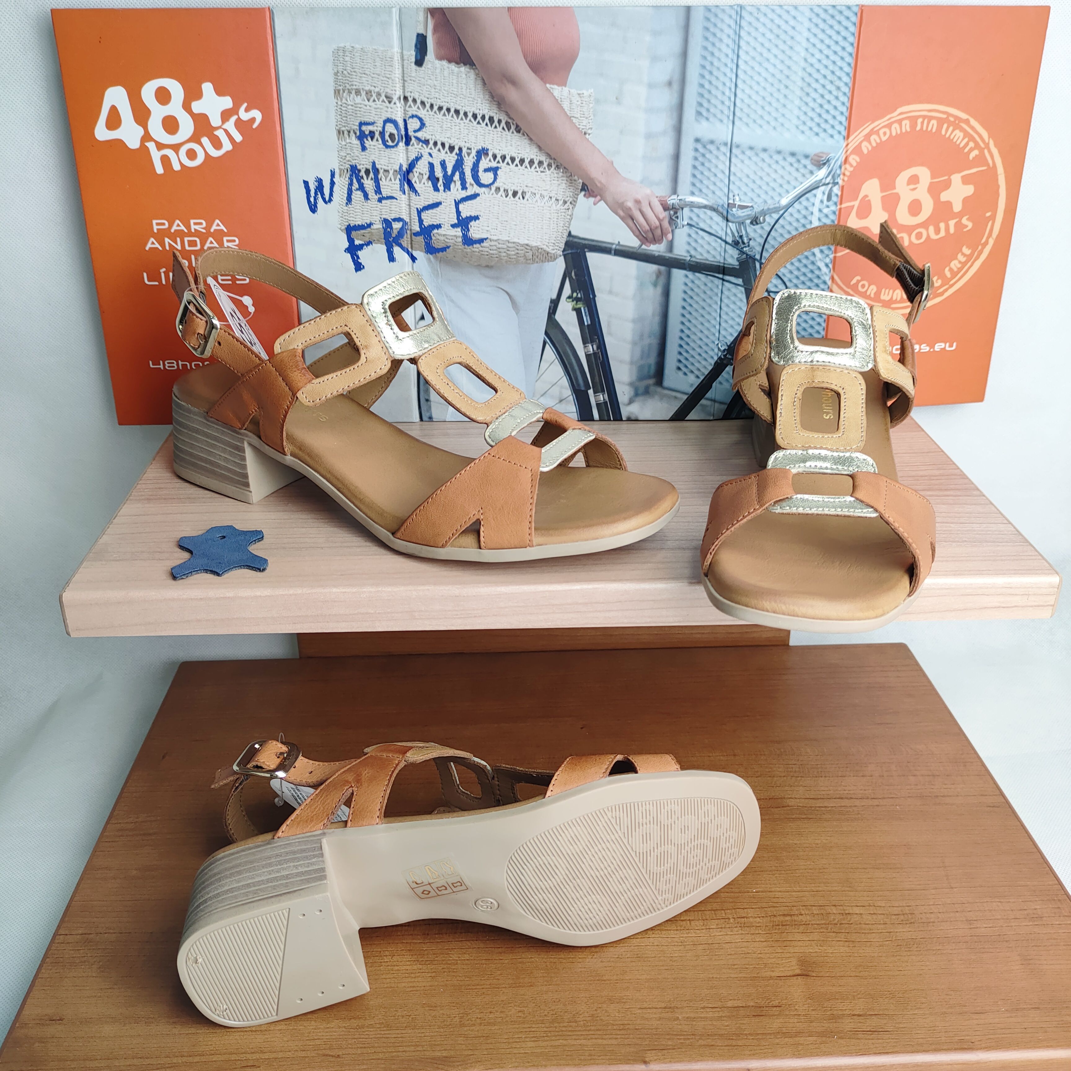 Sandalia Vestir Mujer 48+Hours Piel Cuero Oro y Tostado – Tacón Bajo Confort