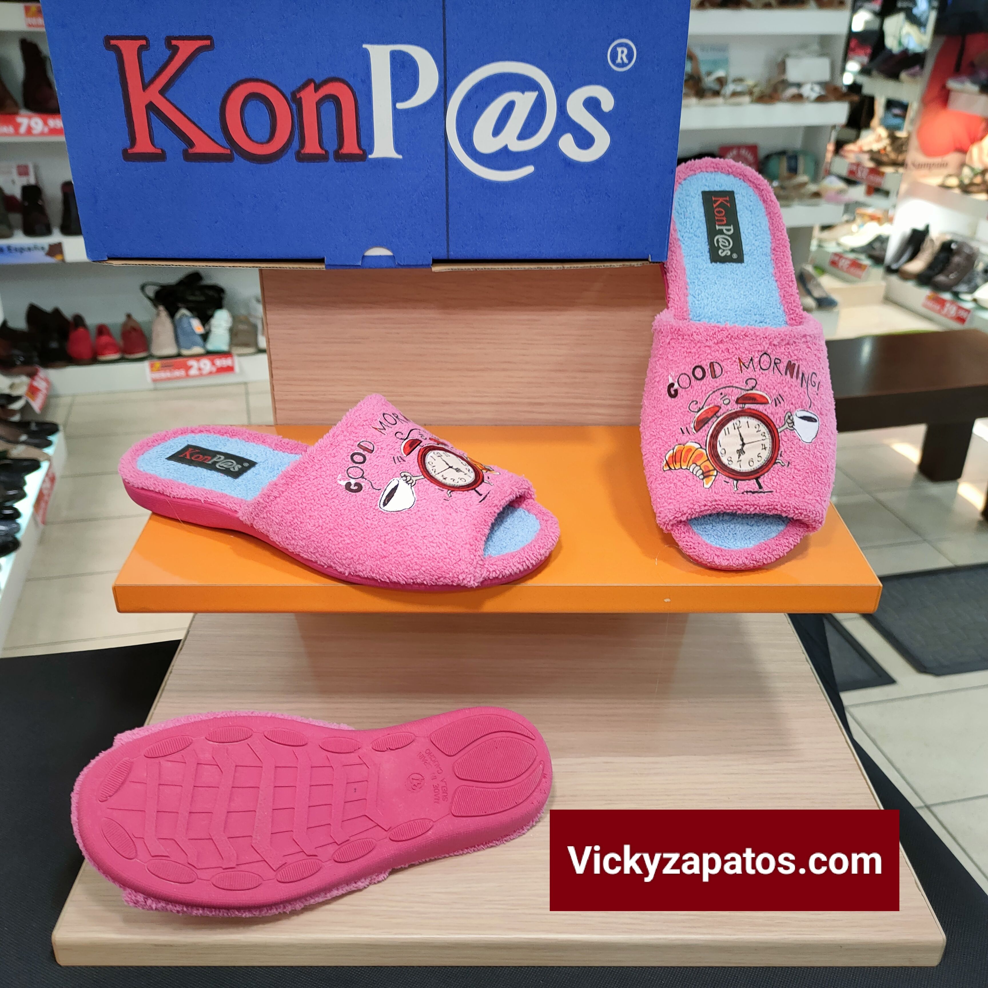 KOMPAS: Zapatilla confort en pala con Serigrafia de Reloj de rizo, disponible en color: Fucsia, piso de caucho máxima Calidad Hechas en España