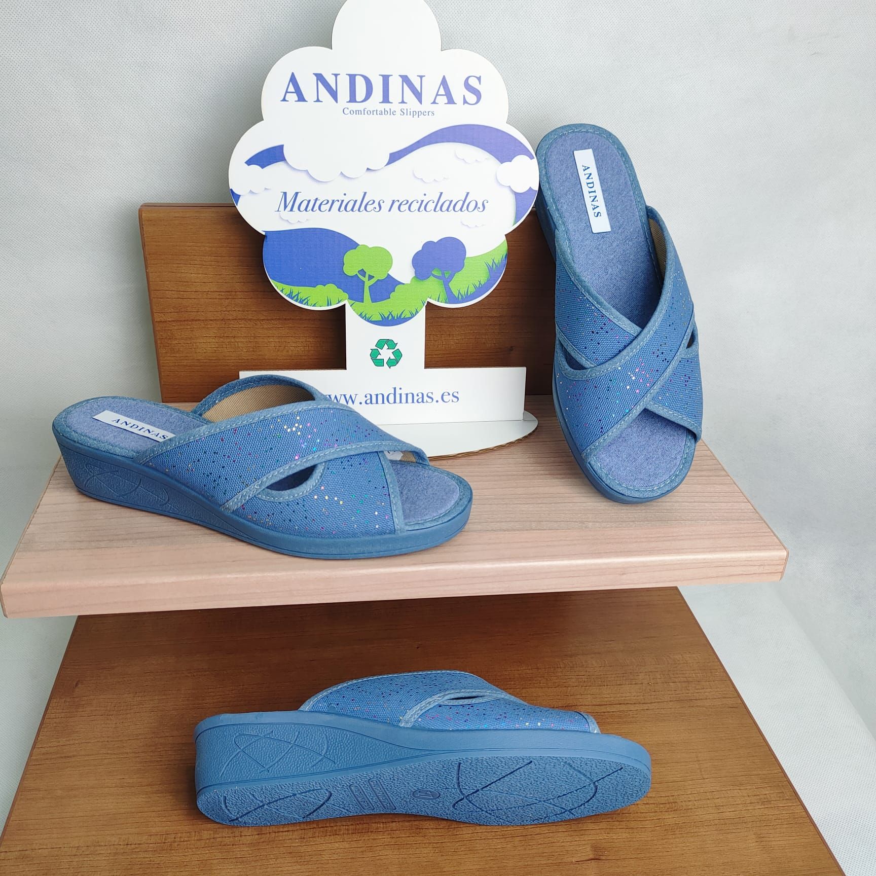 Zapatillas de Casa Mujer ANDINAS Cuña Baja Pala Abierta Azul con Brillo – Hechas en España
