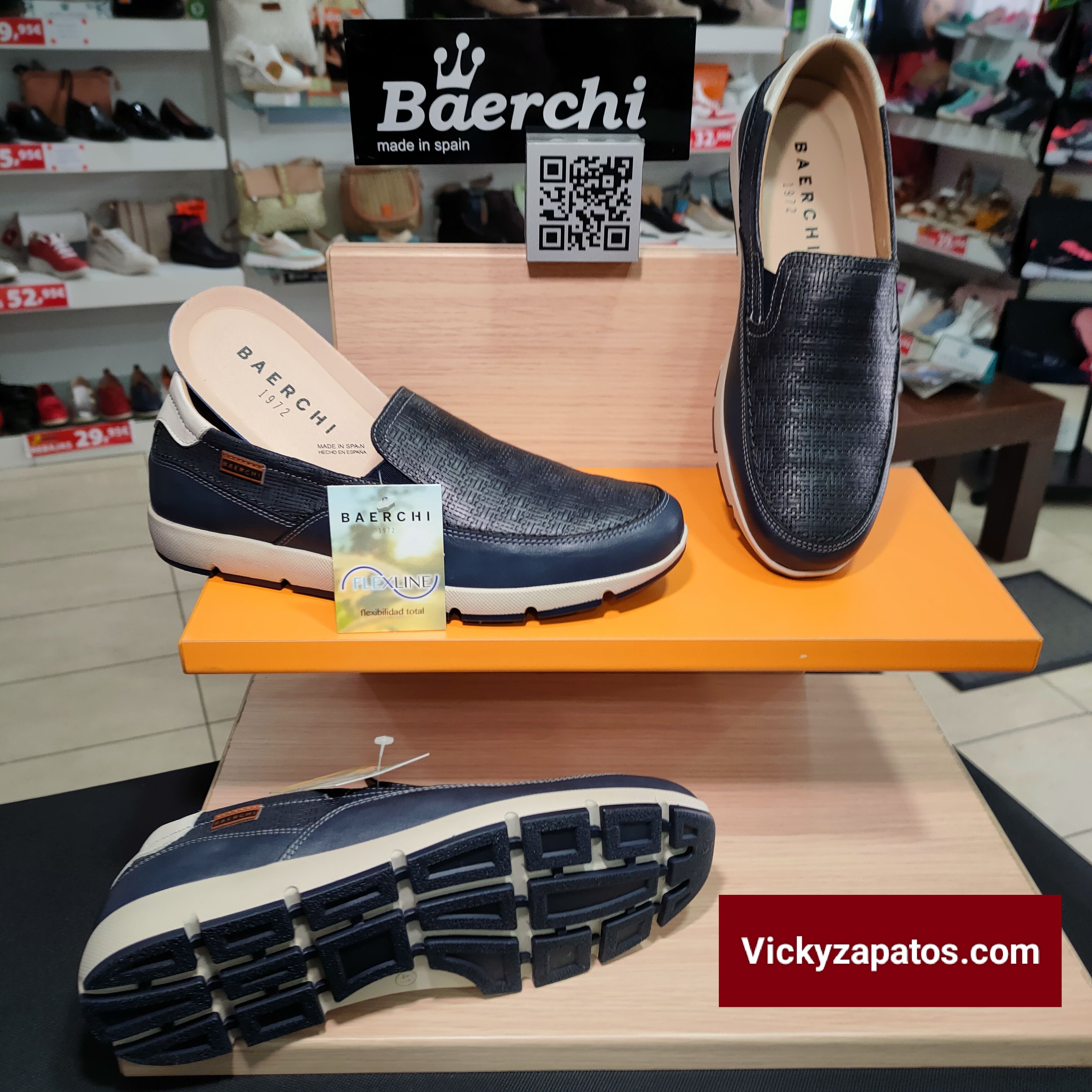 BAERCHI: Zapato mocasín todo en piel con pala grabada, disponible en color Marino y Cuero, plantilla Extraíble con piso FLEXLINE de goma bicolor, Máximo confort Todo Hecho en España