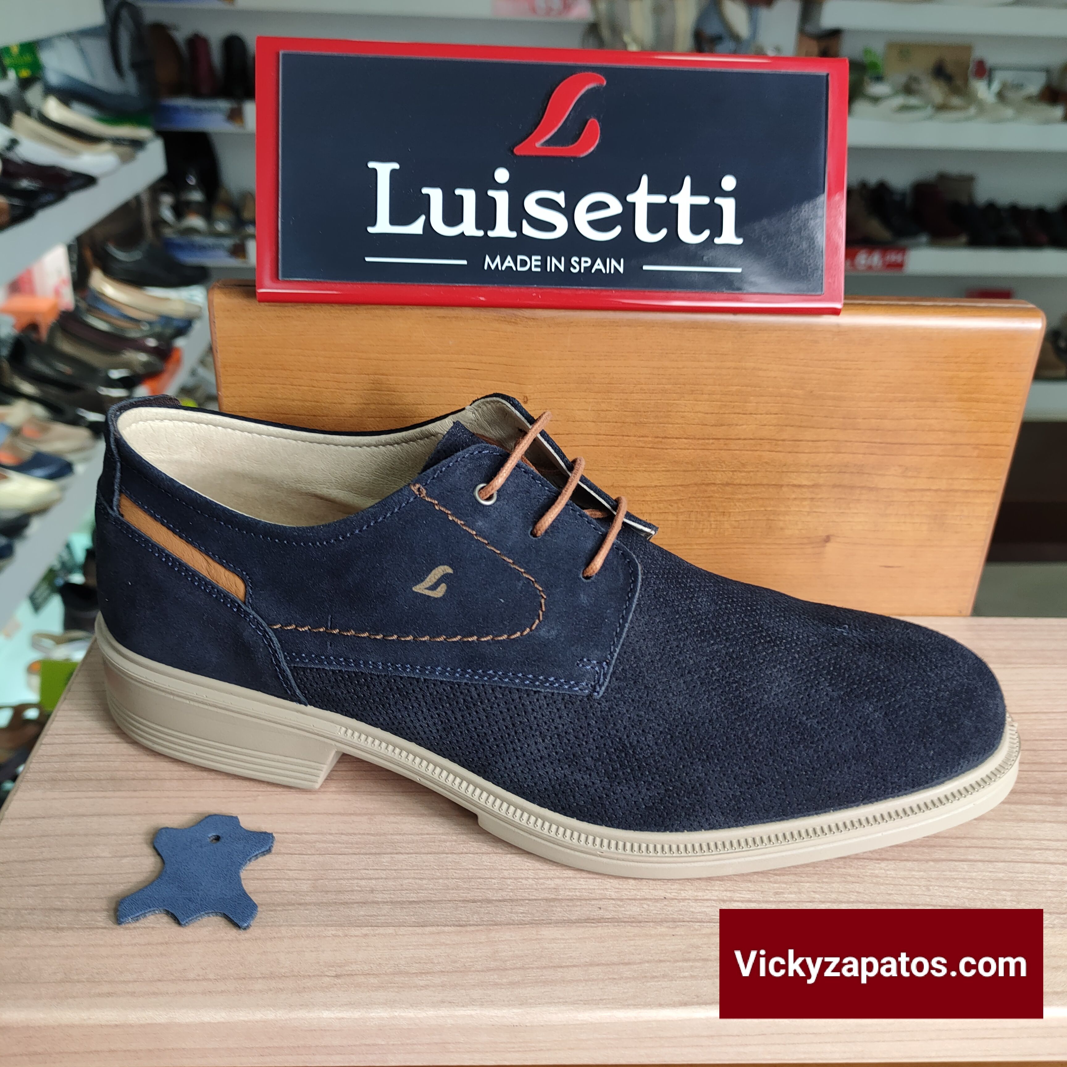 LUISETTI: Zapato de cordón todo en piel Afelpada grabada, disponible en dos colores: Marino y Visón con detalles en Cuero, plantilla extraíble, piso Flex Ultra Light, Hechos en España