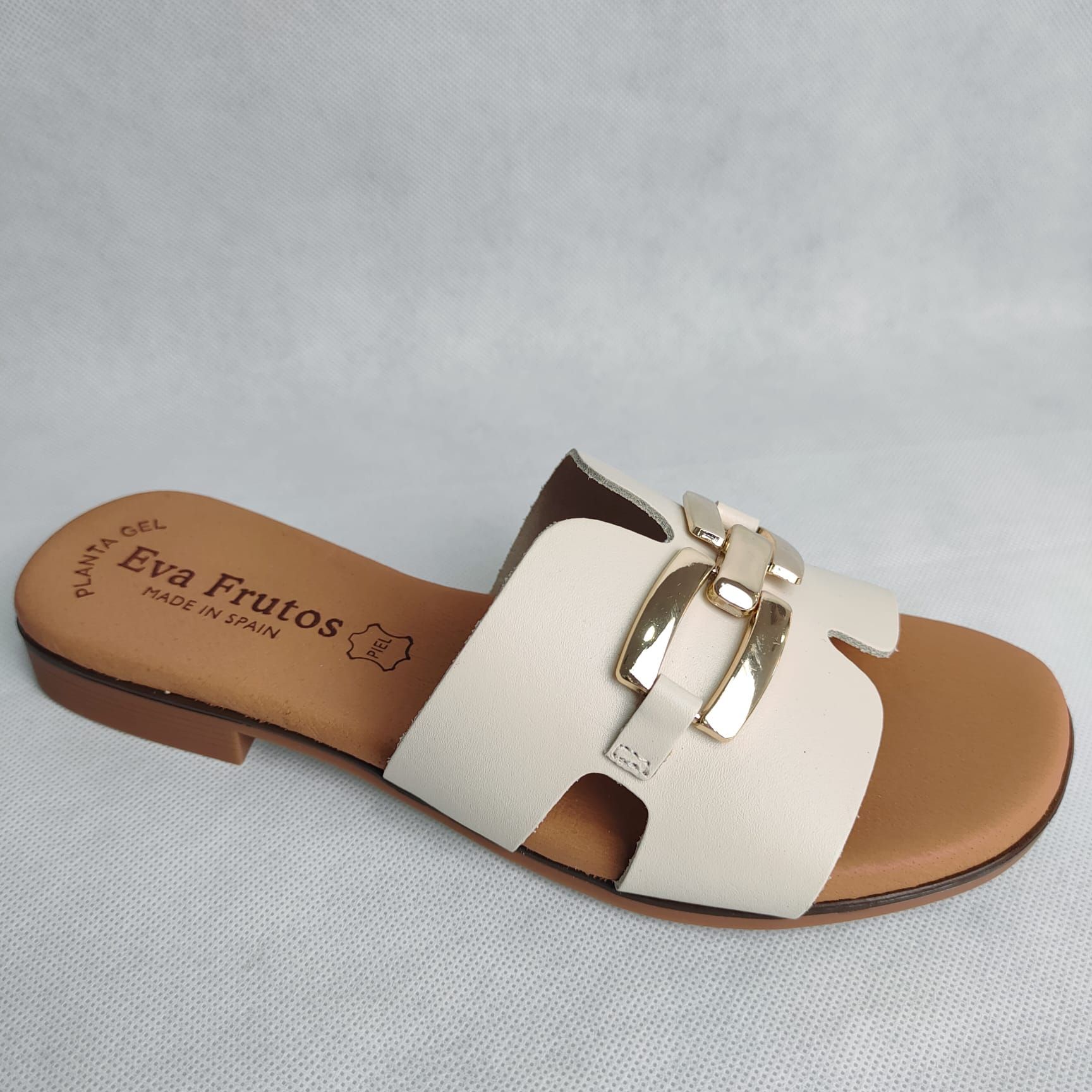 Zueco de piel en color beige con planta de gel y piso de caucho. Máximo confort y calidad. Hecho en España. Tallas del 35 al 41.