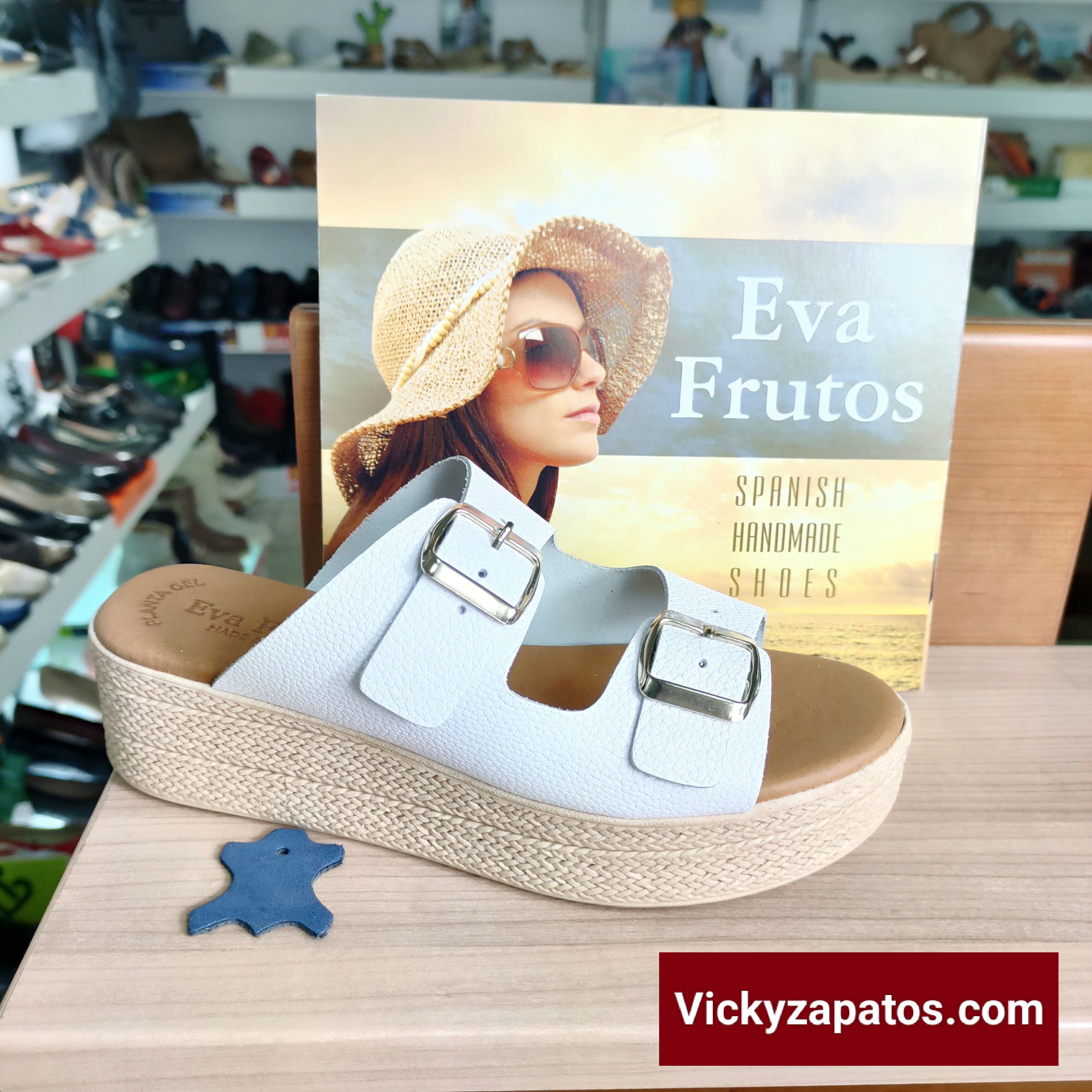 EVA FRUTOS: Zueco de piel con planta de gel, Pala grabada con dos tiras de Hebilla en la pala Disponibles en Dos Colores: Blanco y Negro, piso de Poliuretano con plataforma simulando el Cáñamo, Hechas en España Calidad al Mejor Precio
