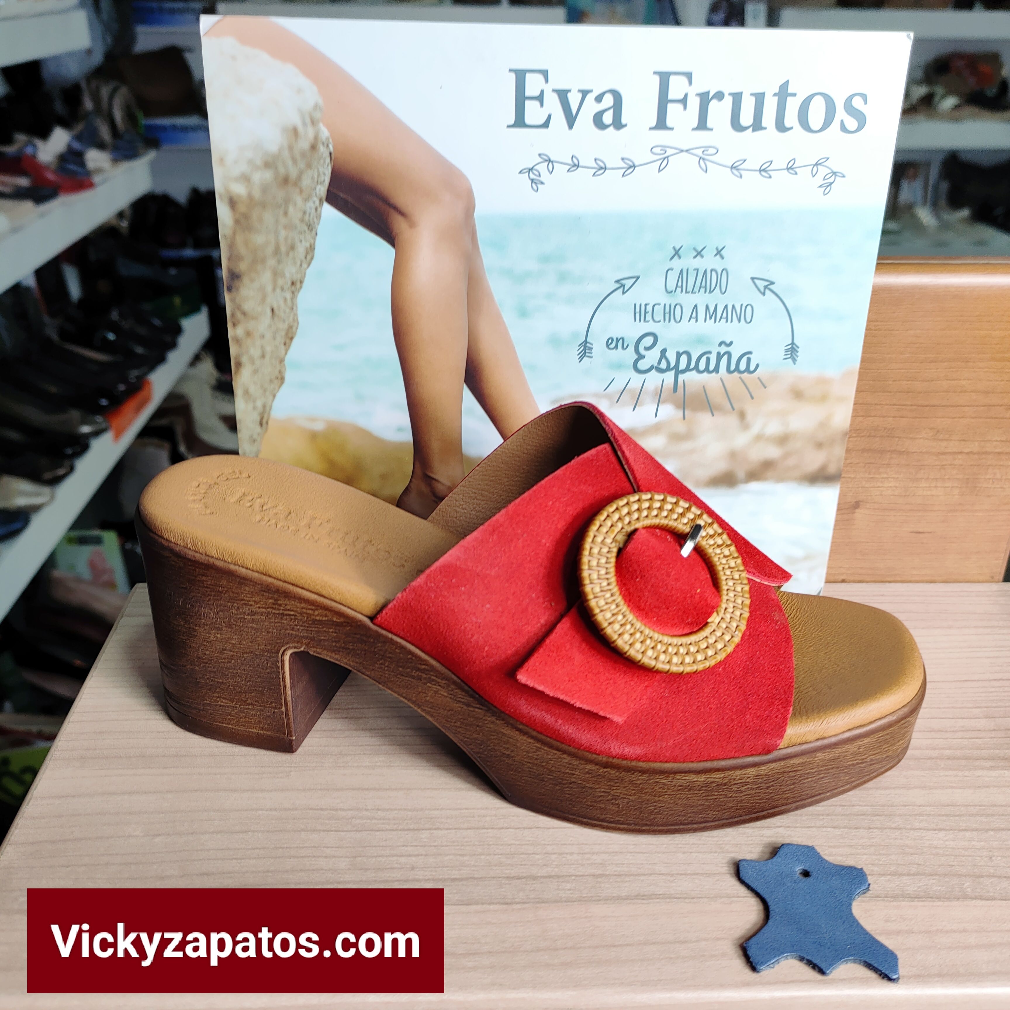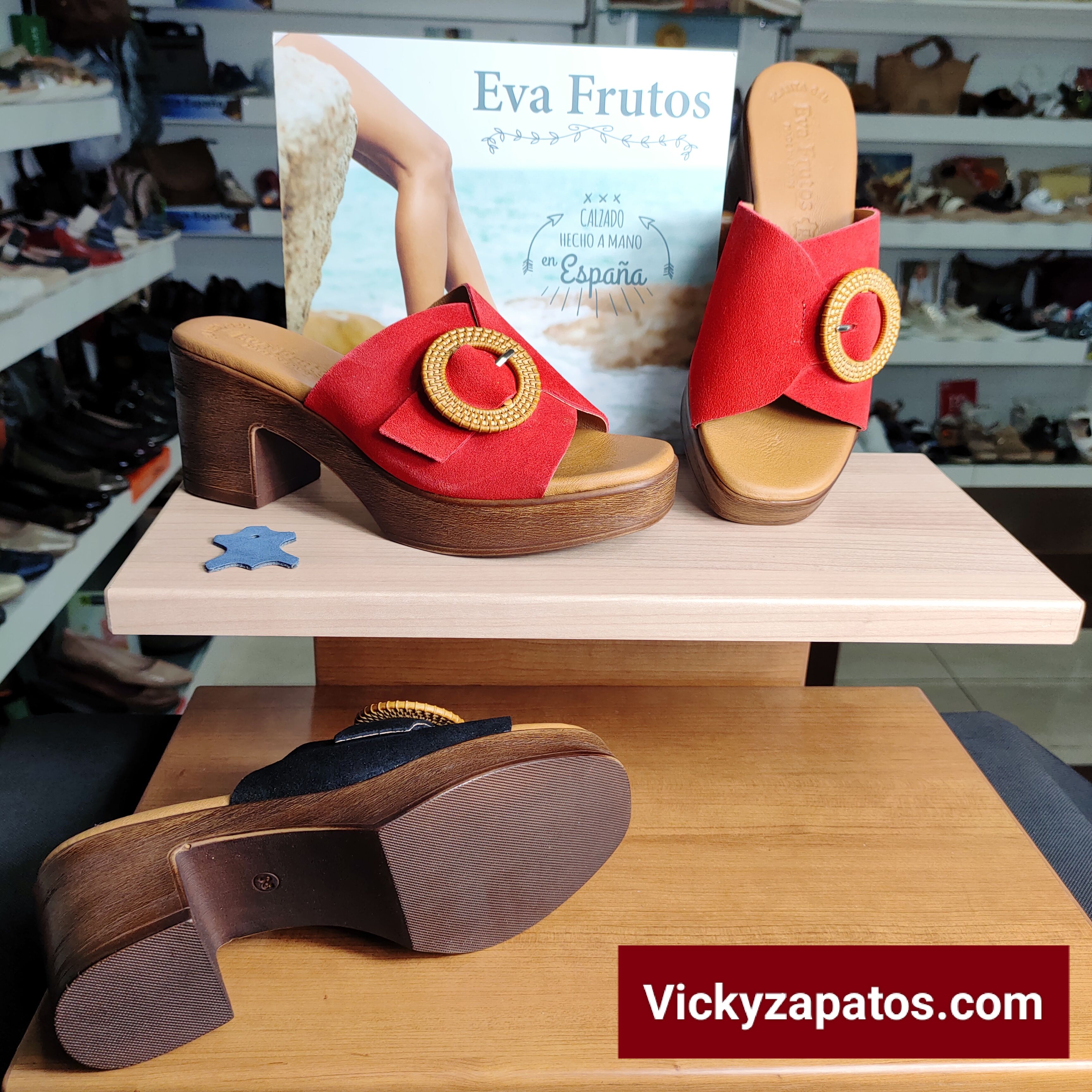 EVA FRUTOS: Zueco de Piel Afelpada con Hebilla de madera en la Pala, Planta de gel y Piel con Piso de Tacón Medio con Plataforma, Disponible en Tres Colores: Rojo, Cuero y Negro, Moda con el Máximo Confort Hechas en España